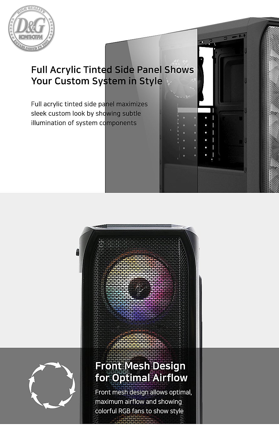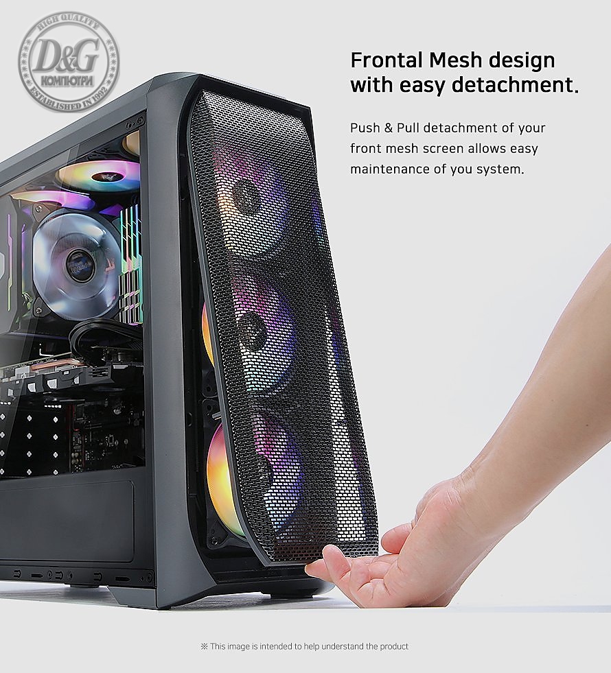 | ВКЛЮЧЕНИ ВЕНТИЛАТОРИ | Front : 3 x 120 mm (with Spectrum RGB LED Effect) Rear : 1 x 120 mm (with Spectrum RGB LED Effect) |