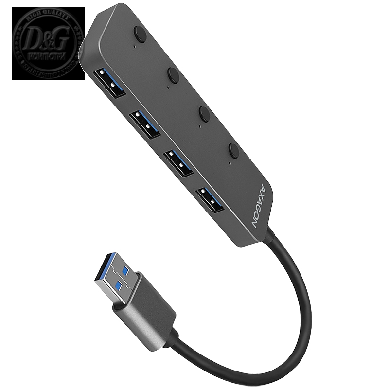 AXAGON HUE-MSA 4x USB3.2 Gen 1 SWITCH hub, metal, micro USB power IN, 20cm USB-A cable
