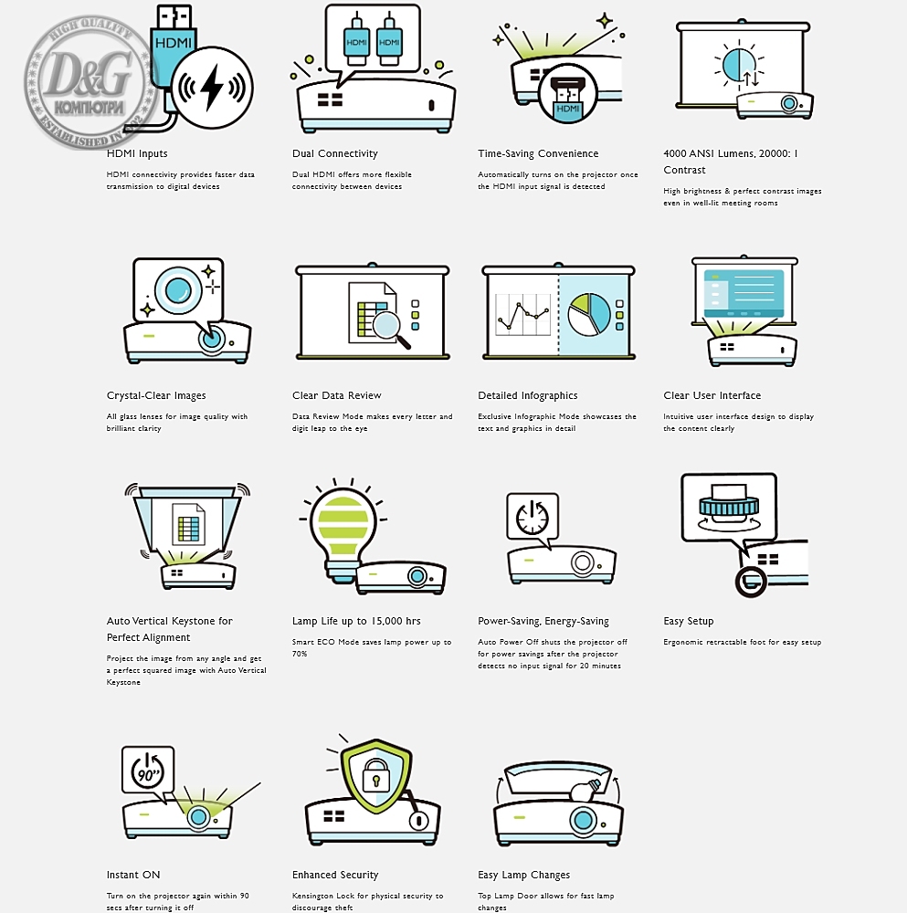 Други: 1D Auto Keystone, High Brightness, Spreadsheet mode, Bright Mode, Presentation Mode, Infographic Mode, Video Mode, Srgb Mode