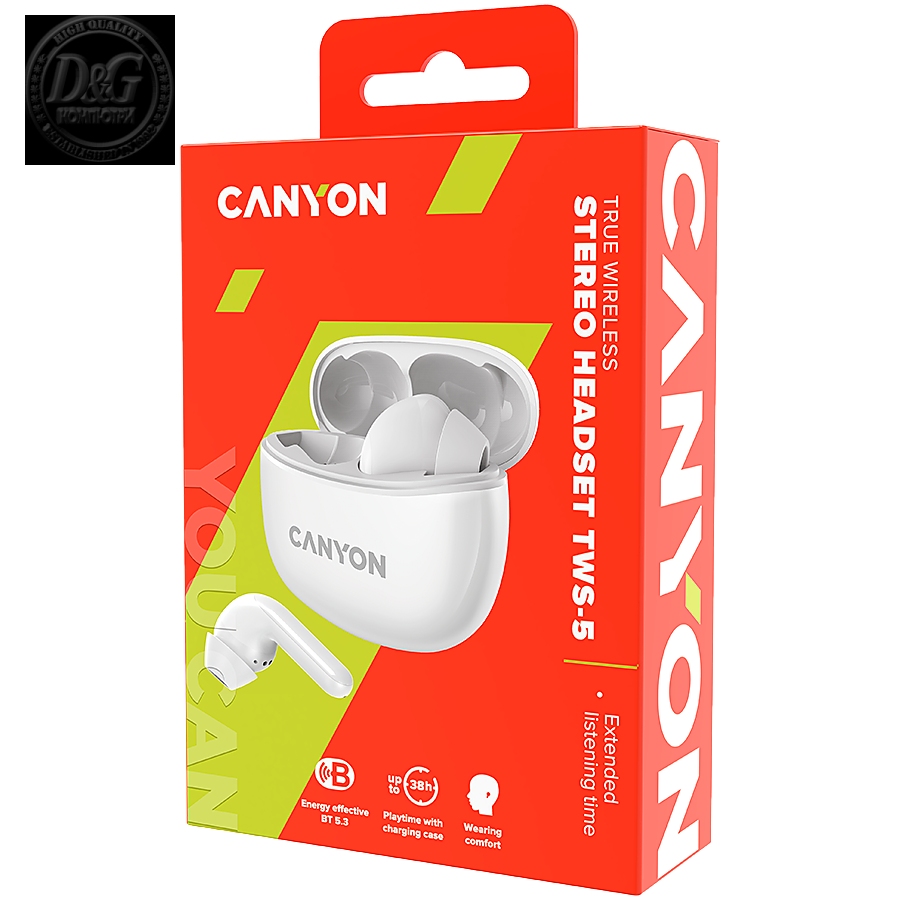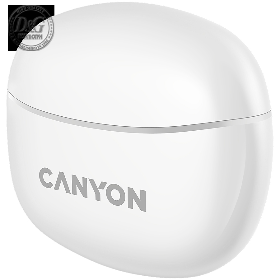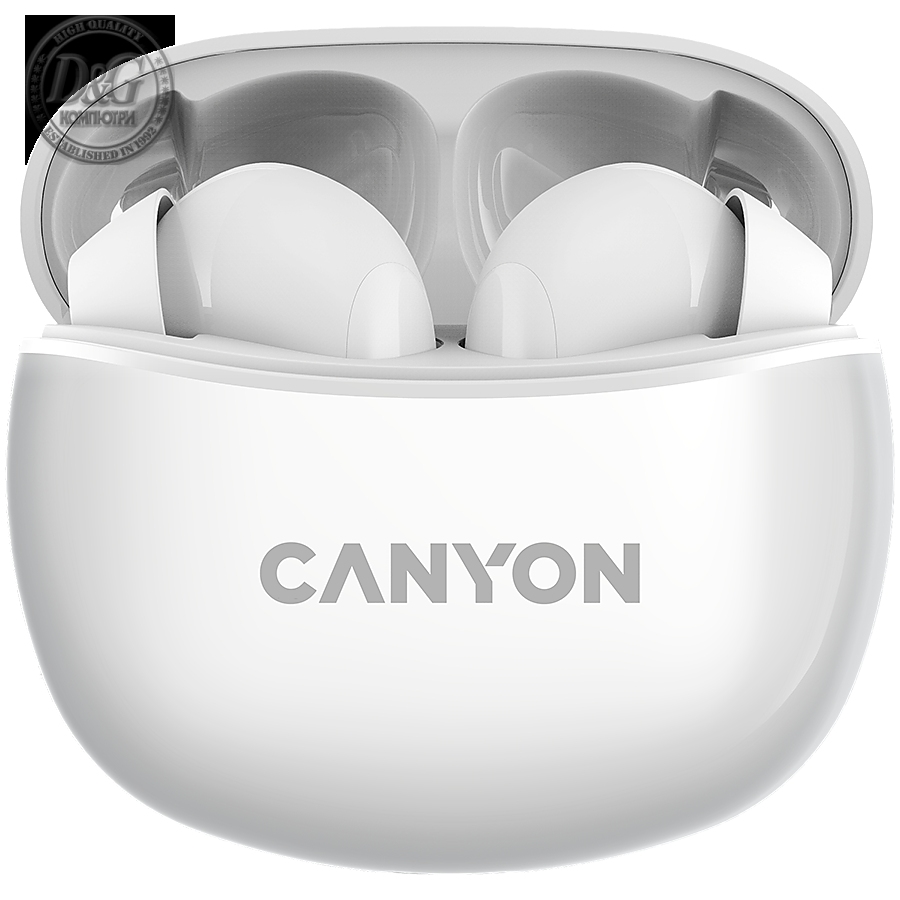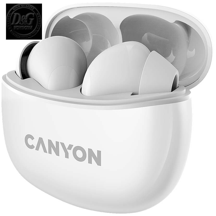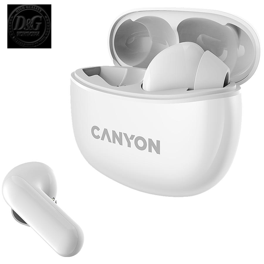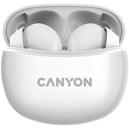 Canyon TWS-5 Bluetooth headset, with microphone, BT V5.3 JL 6983D4, Frequence Response:20Hz-20kHz, battery EarBud 40mAh*2+Charging Case 500mAh, type-C cable length 0.24m, size: 58.5*52.91*25.5mm, 0.036kg, White