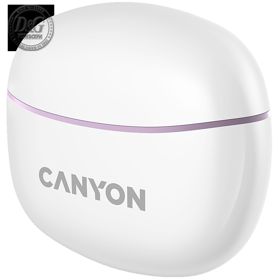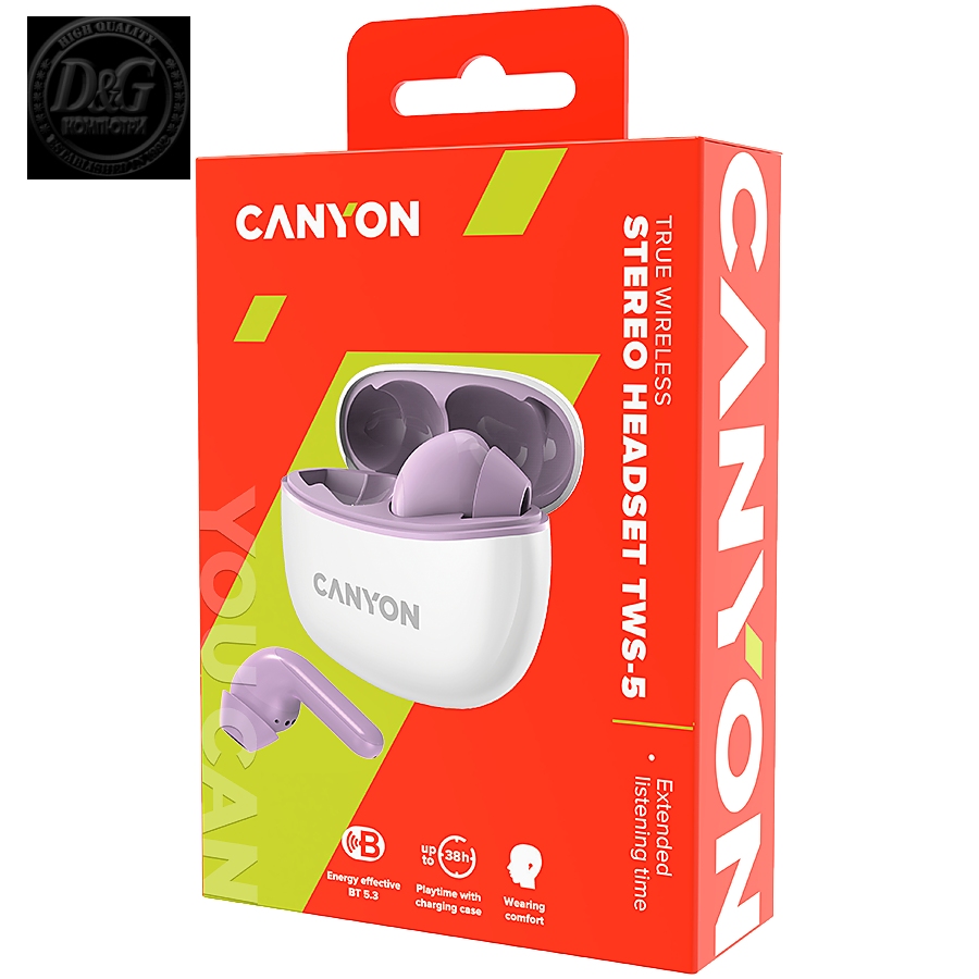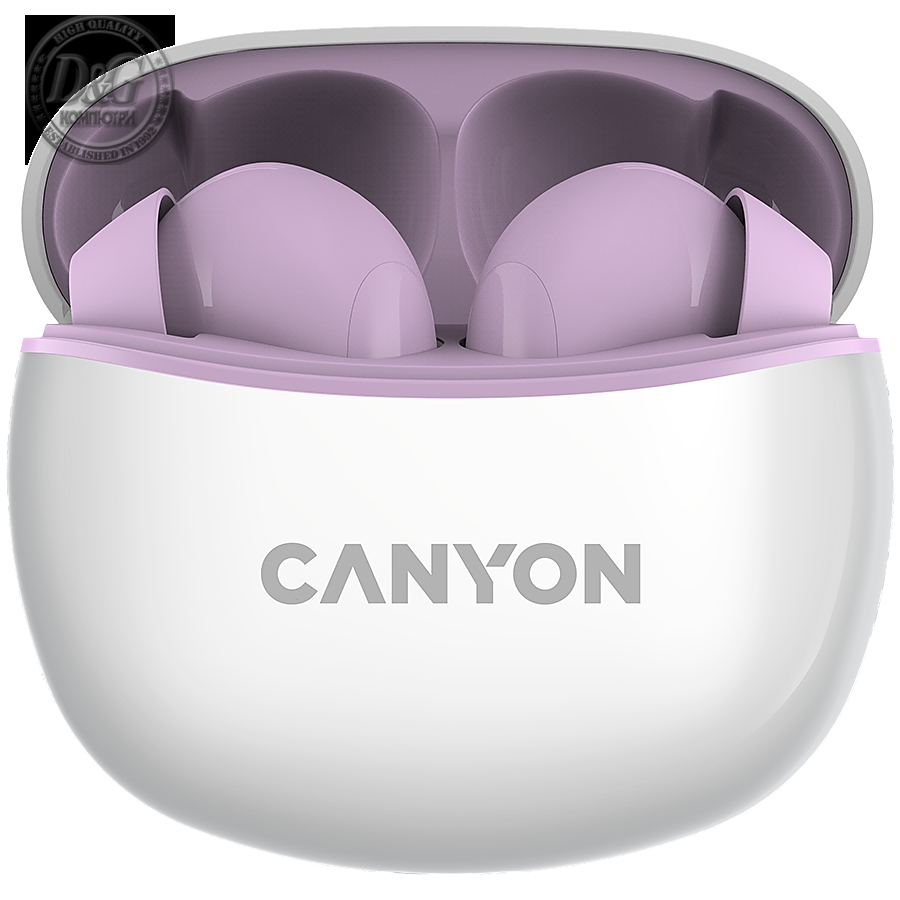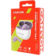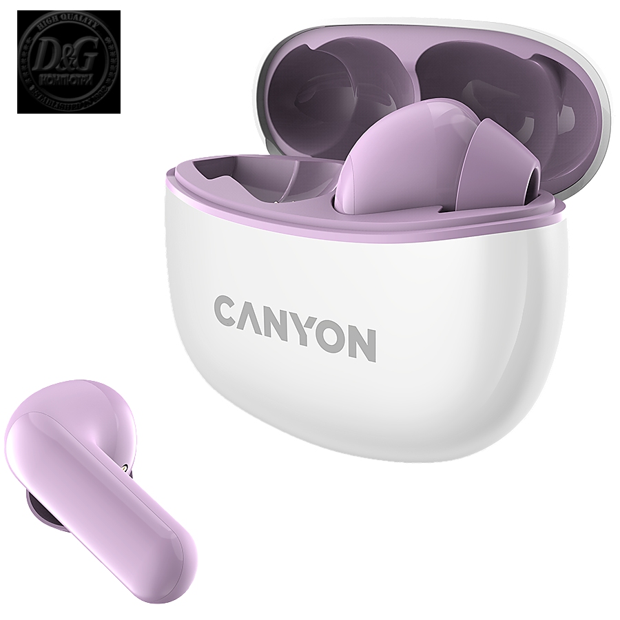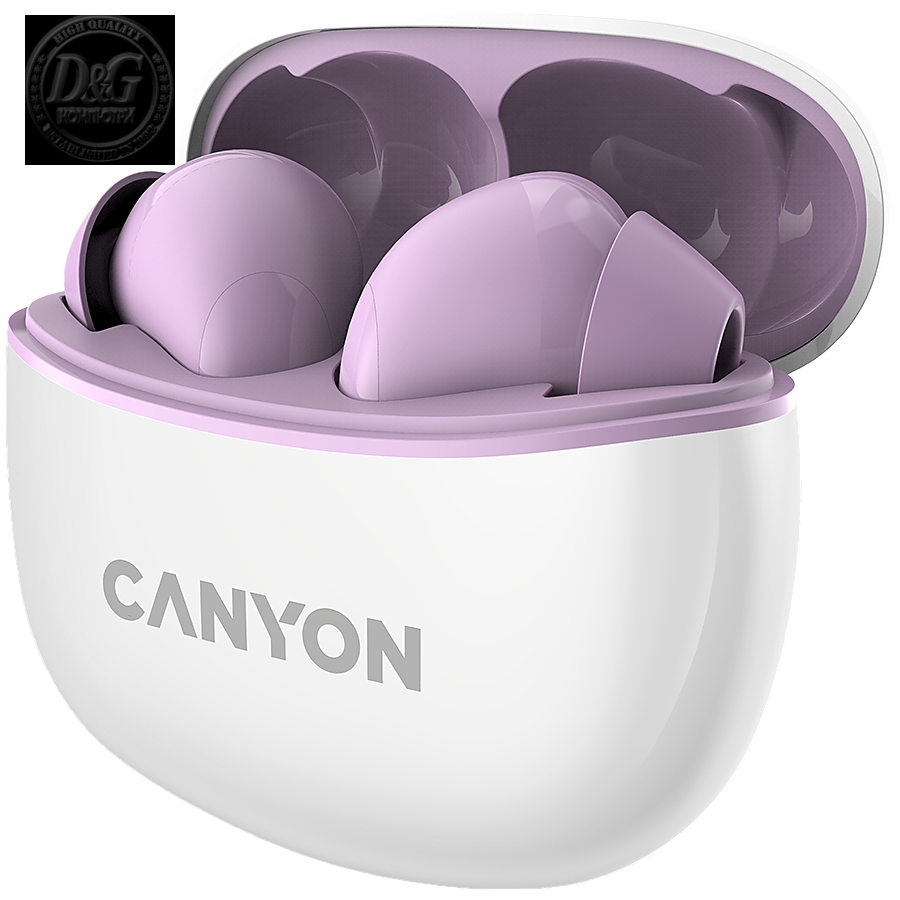 Canyon TWS-5 Bluetooth headset, with microphone, BT V5.3 JL 6983D4, Frequence Response:20Hz-20kHz, battery EarBud 40mAh*2+Charging Case 500mAh, type-C cable length 0.24m, size: 58.5*52.91*25.5mm, 0.036kg, Purple