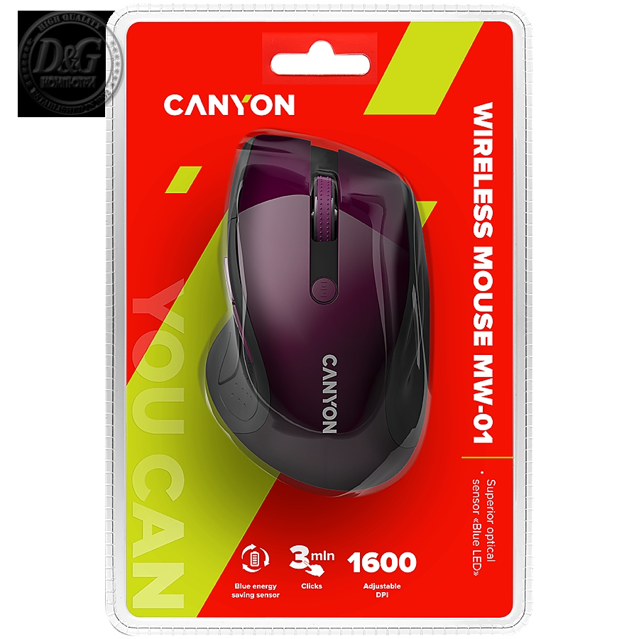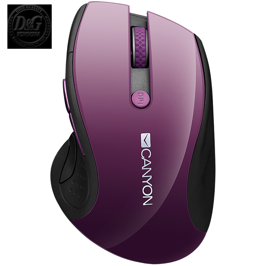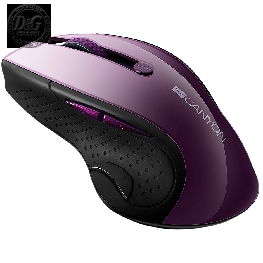 Canyon 6 buttons wireless 2.4Ghz mouse, MX8650A Sensor, DPI up to 1600,Injection case, 3 M life times left and right switches, 2xAAA battery, ABS material. Size: 105x71x40mm, Weight: 59g, Dark grey