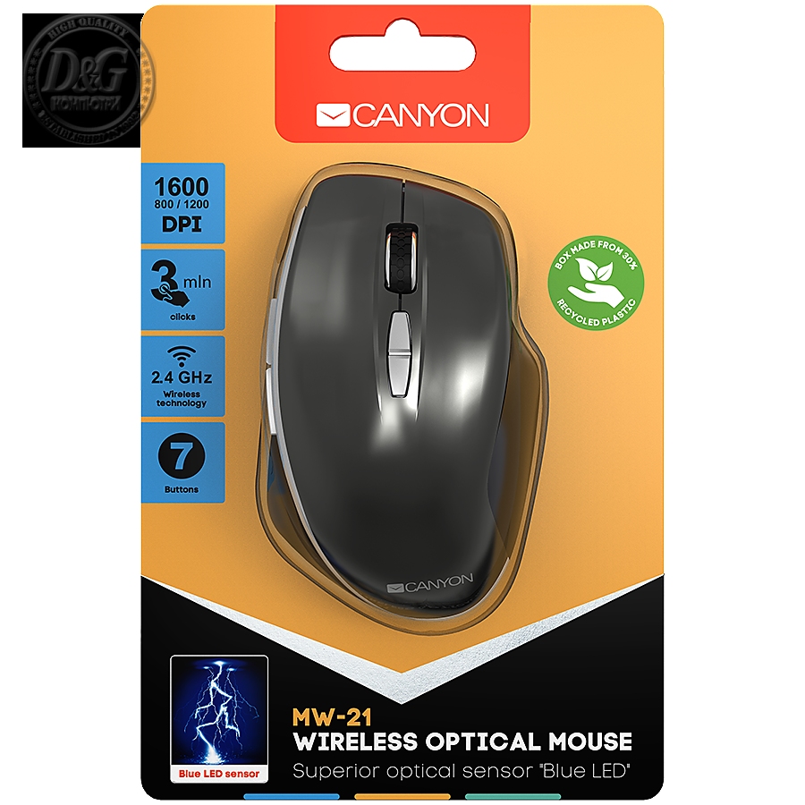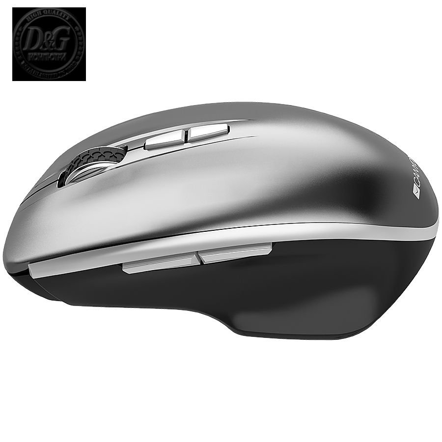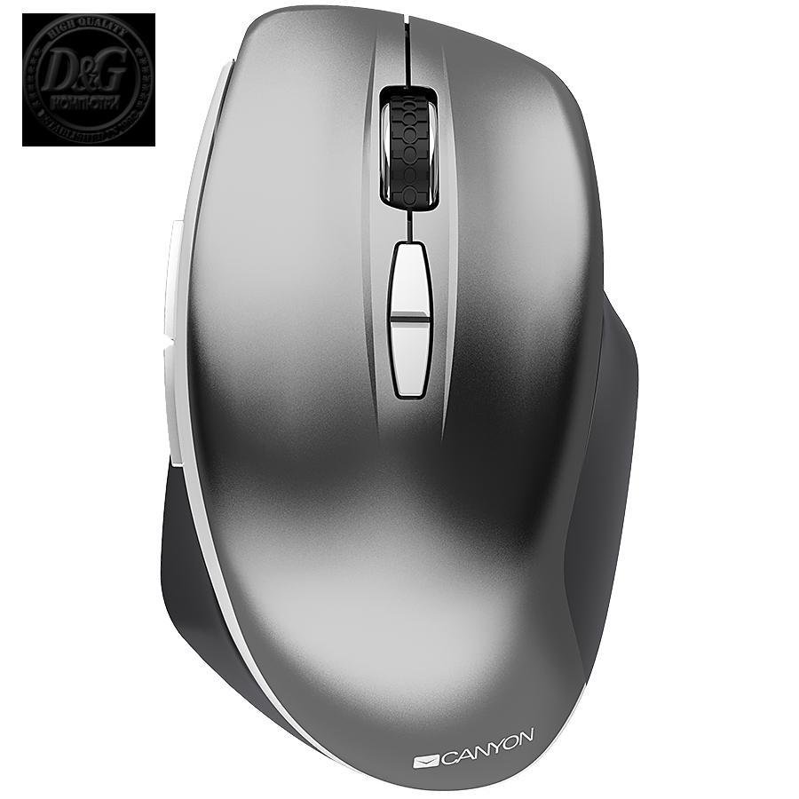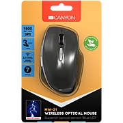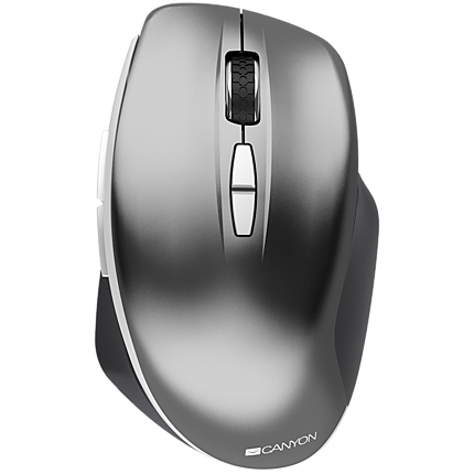 Canyon 6 buttons wireless 2.4Ghz mouse, MX8650A Sensor, DPI up to 1600,Injection case, 3 M life times left and right switches, 2xAAA battery, ABS material. Size: 105x71x40mm, Weight: 59g, Dark grey
