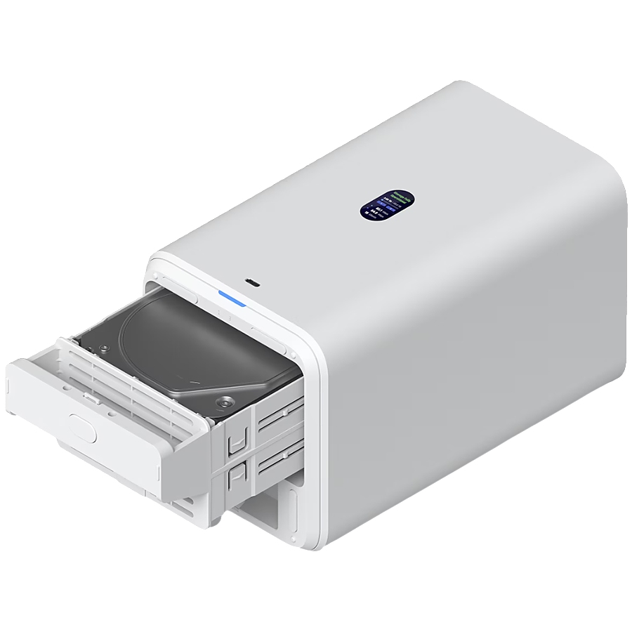 Ubiquiti UniFi UNAS-2-W-EU Network Attached Storage with (2) 3.5inch HDD bays, 2.5 GbE networking, USB-C connectivity, and an included PoE++ adapter, all in a compact footprint