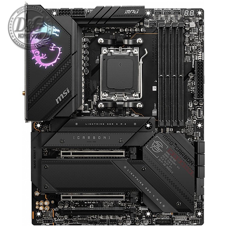 MSI MPG X670E CARBON WIFI, ATX, Socket AM5, 4x DDR5, Type-C DP, 3x PCI-E x16 slots, 4x M.2 slots, 1x HDMI, 2x DP (1x Type-C), 6x USB 3.2 Gen2, 1x USB 3.2 Gen2, 1x USB 3.2 Gen2x2, 2x USB 2.0, Type-C, 7.1 HD Audio, 2.5Gbps LAN, Wi-Fi 6E, BT, 3Y