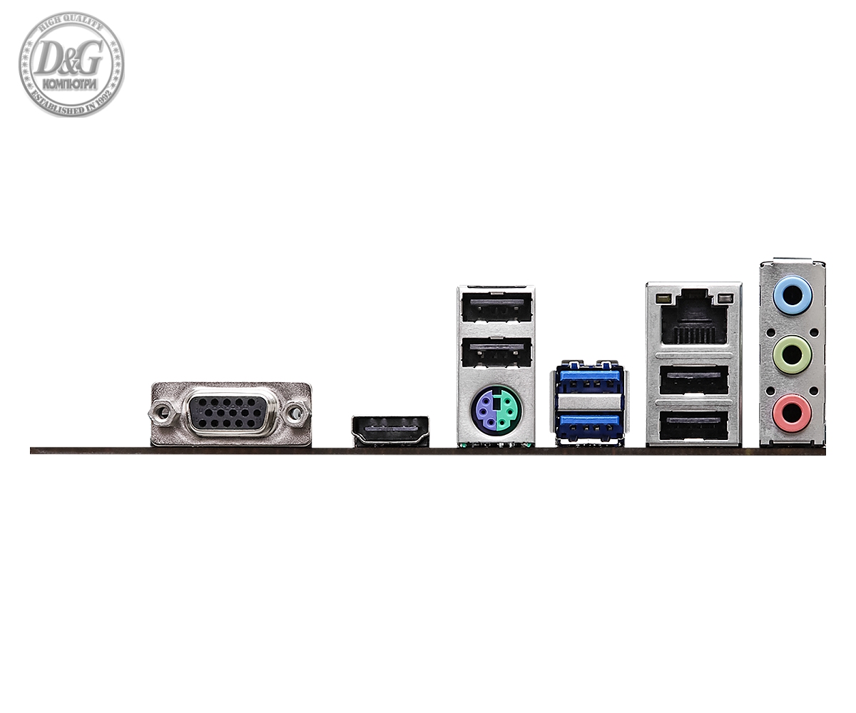 I/O: - 1 x PS/2 Mouse/Keyboard Port; - 1 x D-Sub Port; - 1 x HDMI Port; - 2 x USB 3.2 Gen1 Ports (Supports ESD Protection); - 4 x USB 2.0 Ports (Supports ESD Protection); - 1 x RJ-45 LAN Port with LED (ACT/LINK LED and SPEED LED); - HD Audio Jacks: Line in / Front Speaker / Microphone