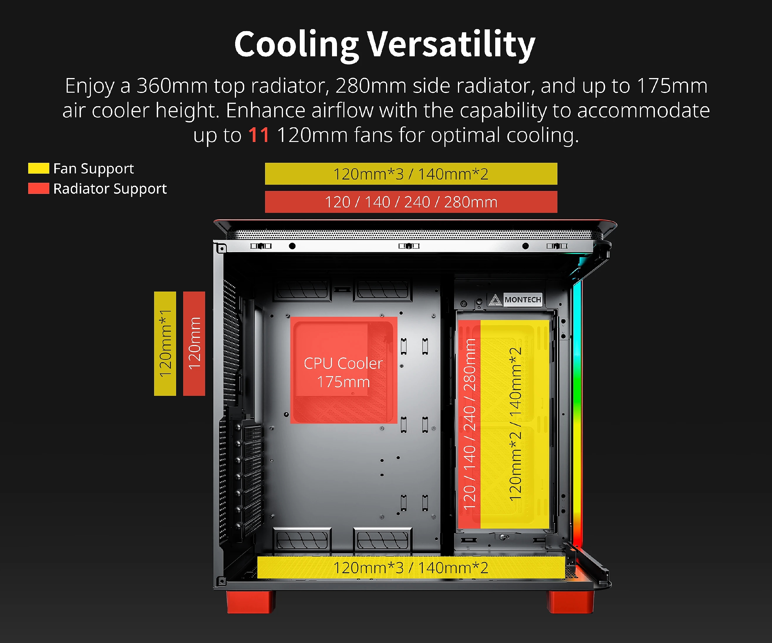 | ПОДДРЪЖКА НА ВОДНО ОХЛАЖДАНЕ | 120 mm - Отзад 280 mm - Отстрани 240 mm - Отстрани 140 mm - Отстрани 120 mm - Отстрани 360 mm - Отгоре 280 mm - Отгоре 240 mm - Отгоре 140 mm - Отгоре 120 mm - Отгоре |