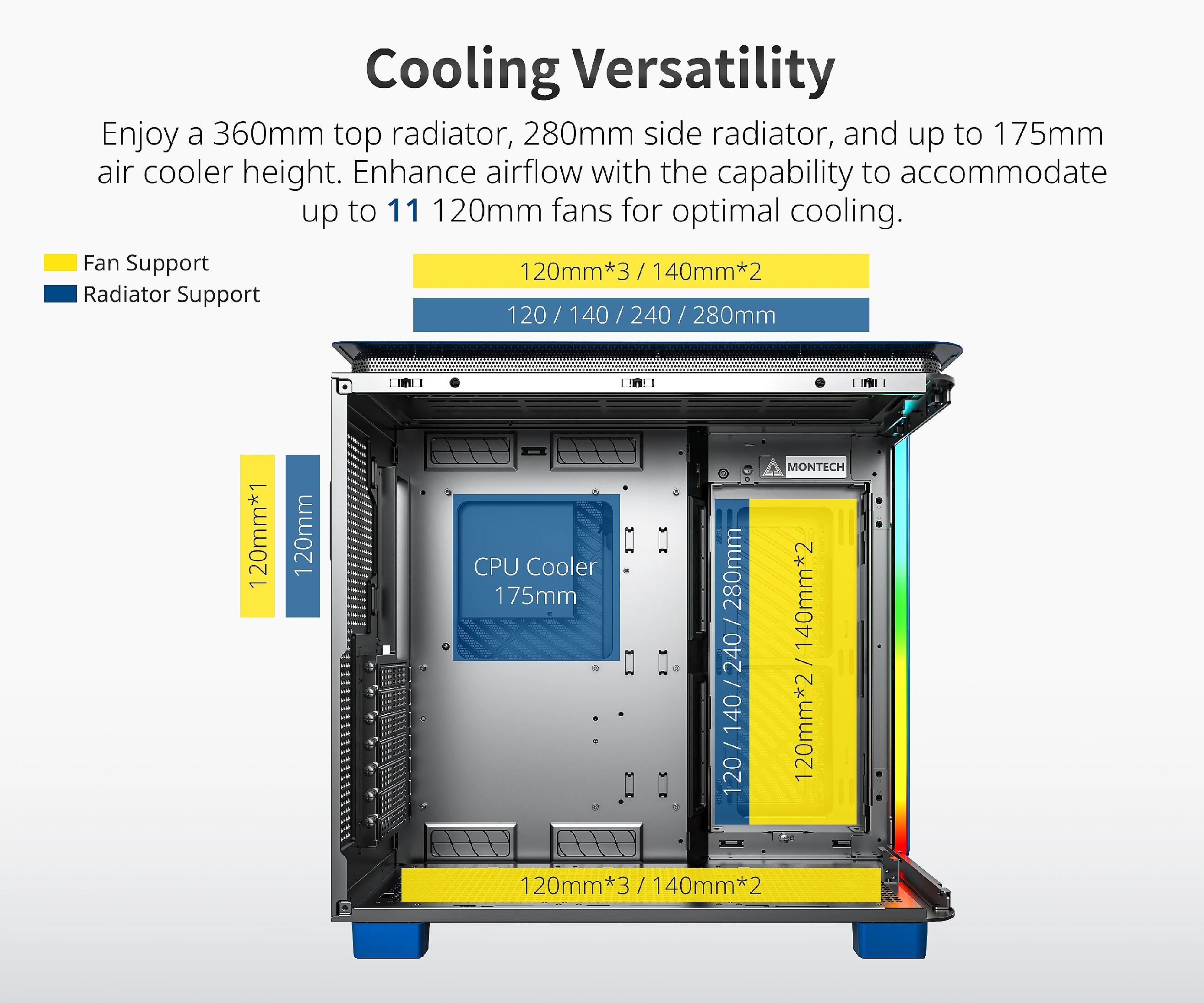 | ПОДДРЪЖКА НА ВОДНО ОХЛАЖДАНЕ | 120 mm - Отзад 280 mm - Отстрани 240 mm - Отстрани 140 mm - Отстрани 120 mm - Отстрани 360 mm - Отгоре 280 mm - Отгоре 240 mm - Отгоре 140 mm - Отгоре 120 mm - Отгоре |