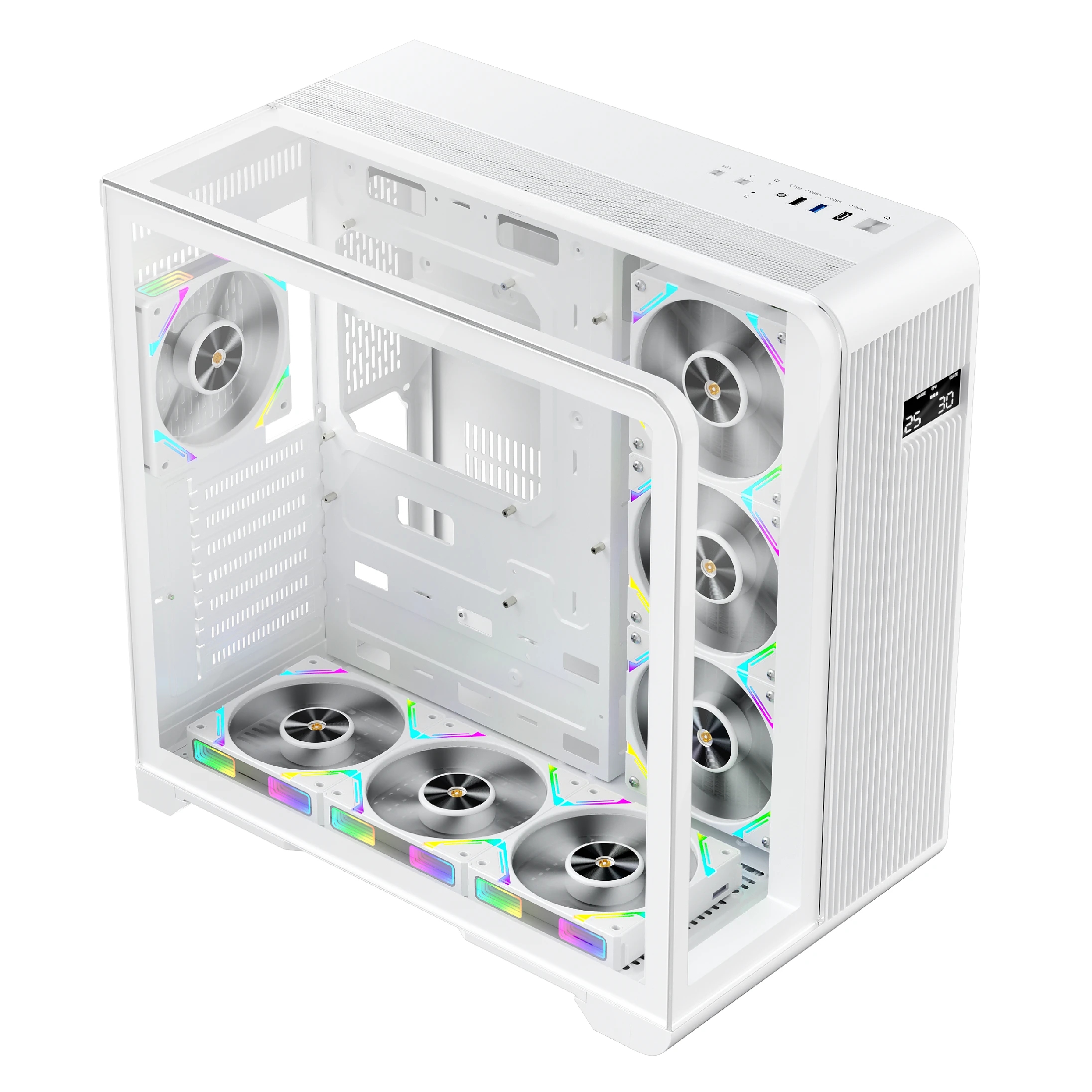 | ДОПЪЛНИТЕЛНИ | Front and top feature intergrated U-shaped tempered glass LED display monitors CPU, memory usage, temperature and frequency Support 360 mm radiator on the right panel Bottom, rear and side ventilation ensures excellent cooling performance Pull-out dust filter at the bottom for easy cleaning and maintainance |