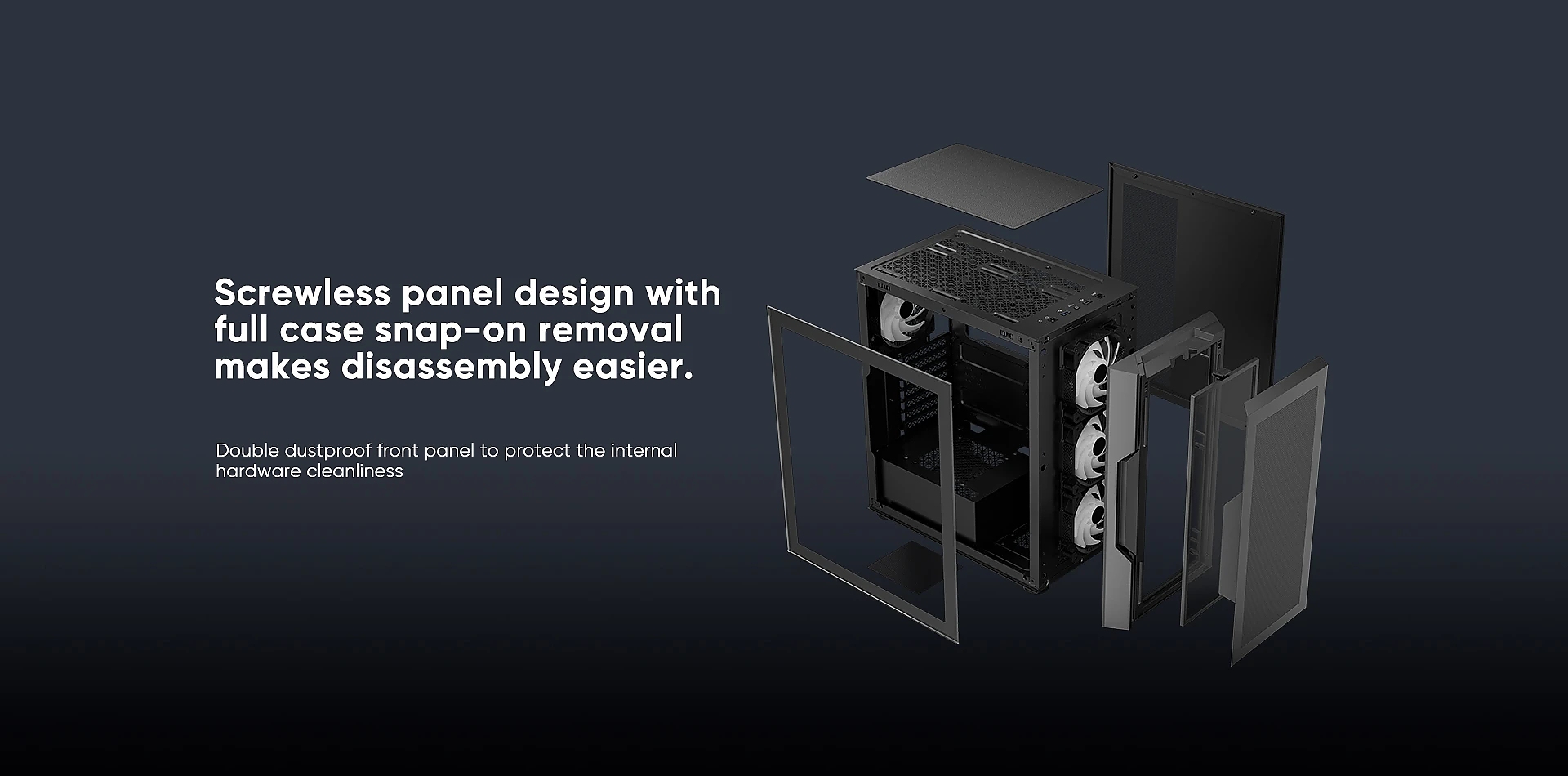 Snap-on front, left, and right panels allowing for quick upgrades and maintenance without the need for screws or additional tools