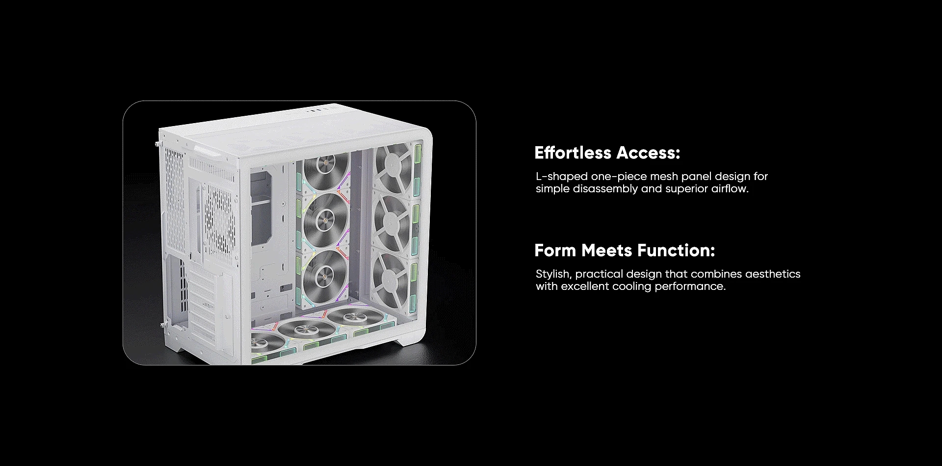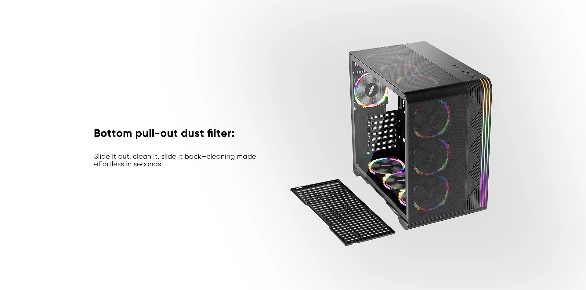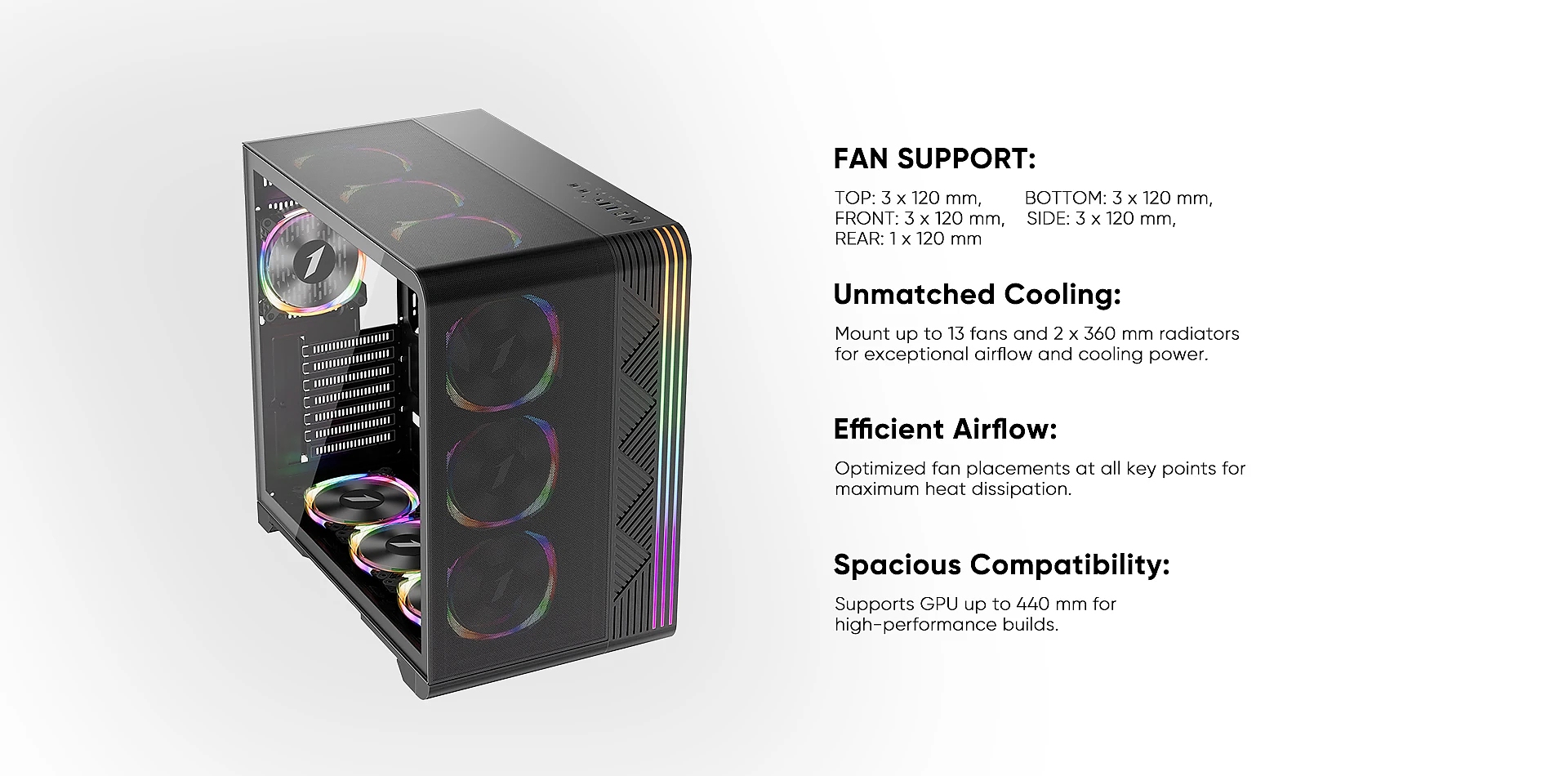 | ДОПЪЛНИТЕЛНИ | Customizable A-RGB light strips Bottom pull-out dust filter One-piece L-shaped mesh panel Supports up to 13 fans |