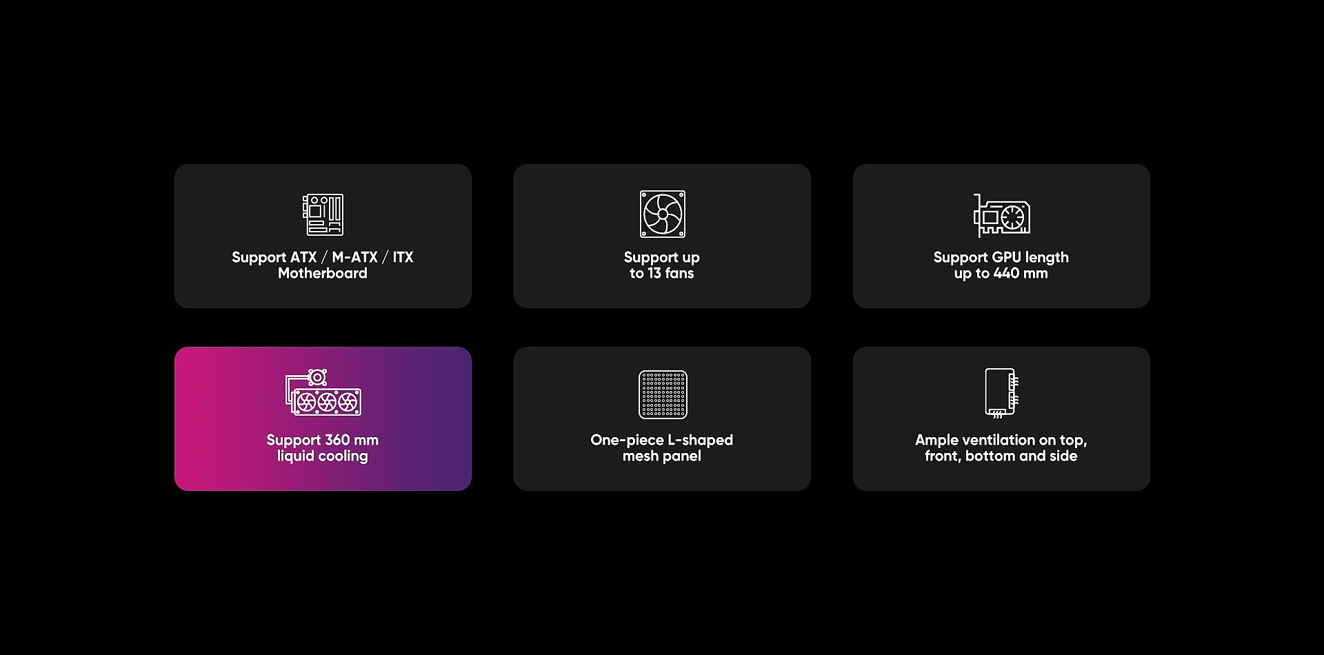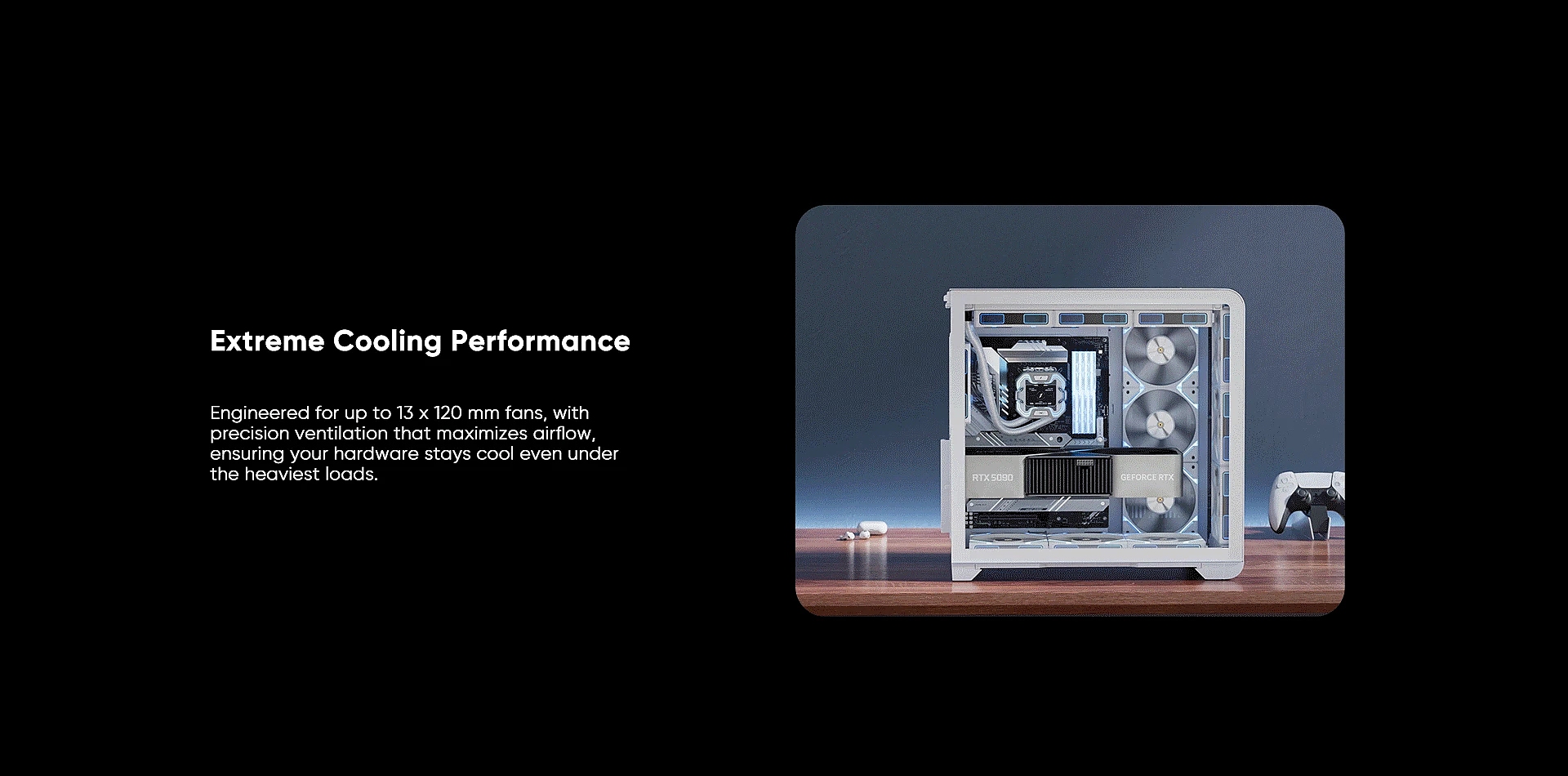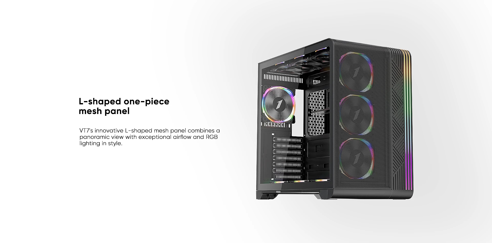 | ДОПЪЛНИТЕЛНИ | Customizable A-RGB light strips Bottom pull-out dust filter One-piece L-shaped mesh panel Supports up to 13 fans |