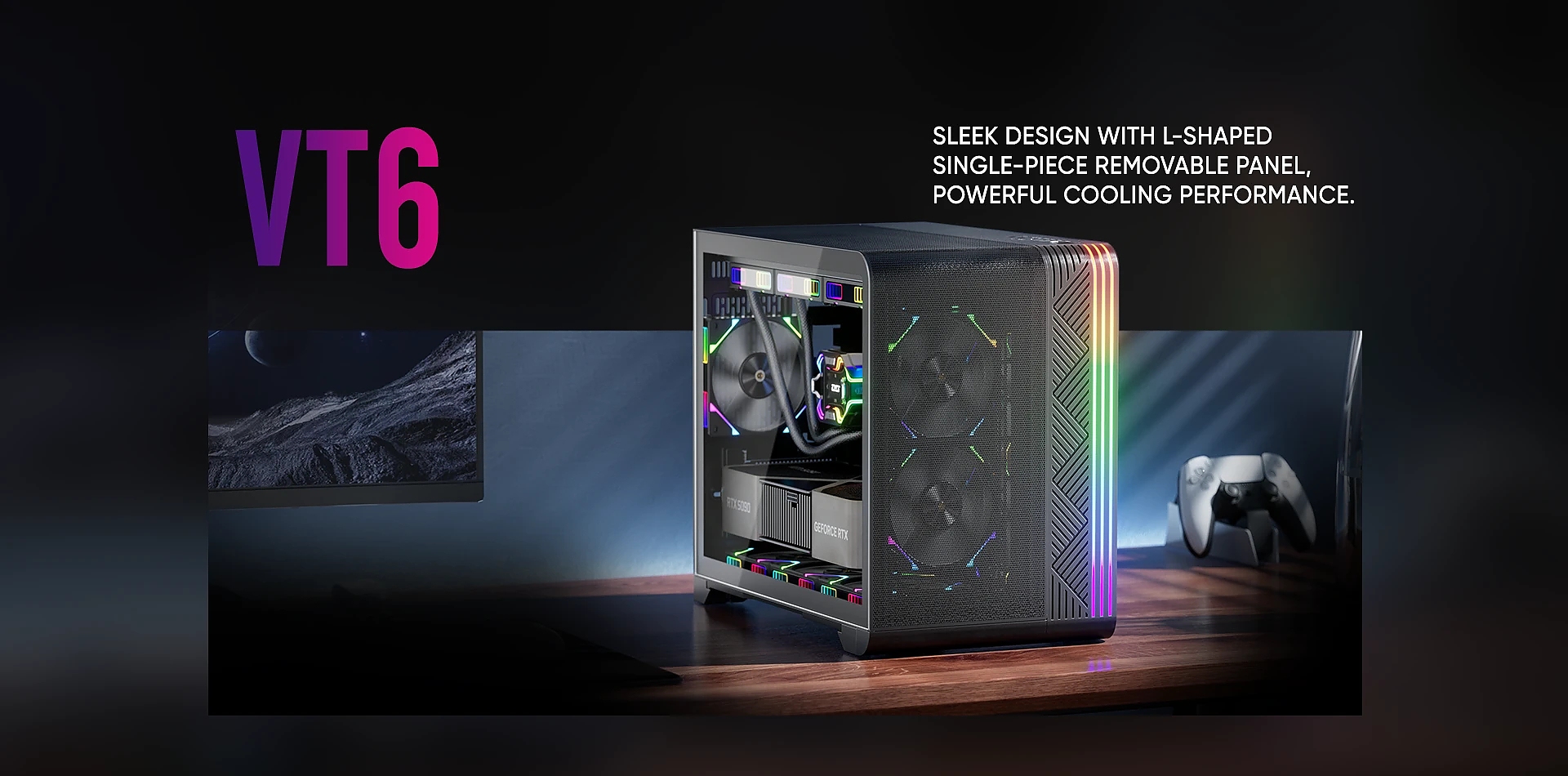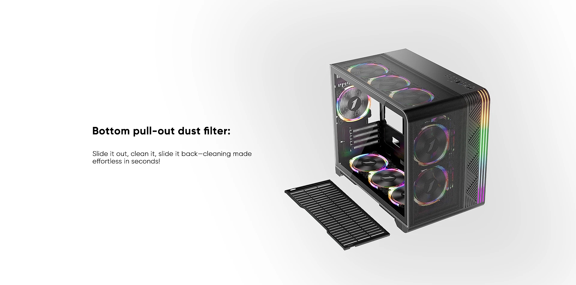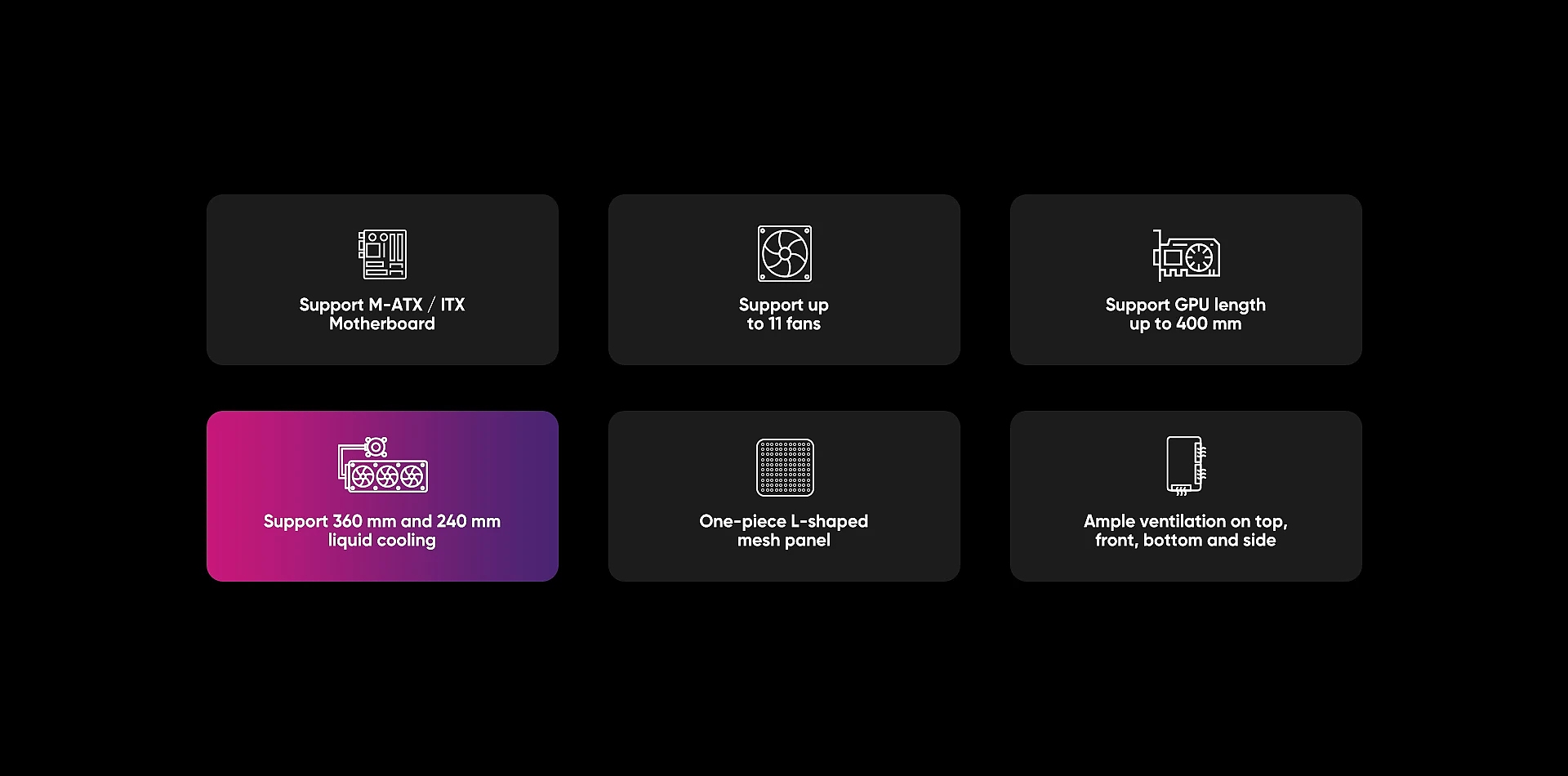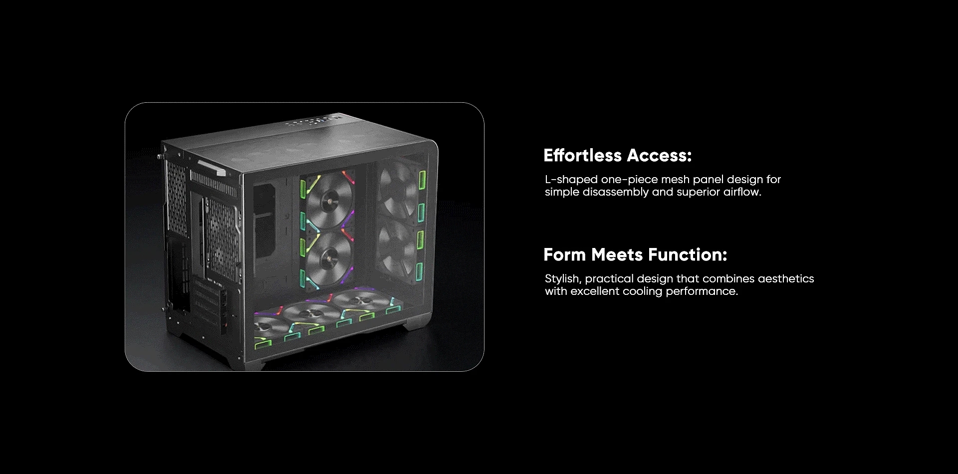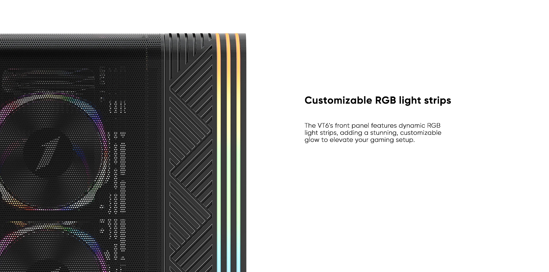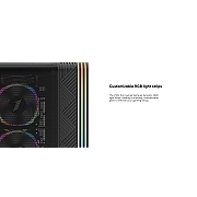 | ДОПЪЛНИТЕЛНИ | Customizable A-RGB light strips Seamlessly integrated front and top mesh panels Pull-out dust filter at the bottom for easy cleaning and maintainance Support up to 11 fans |
