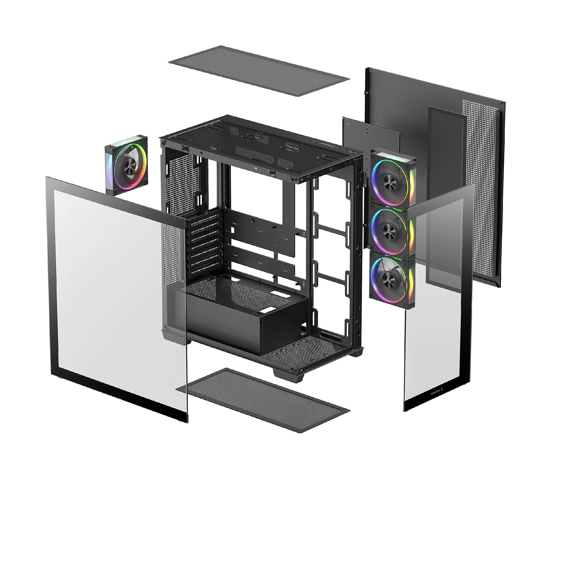 | ДОПЪЛНИТЕЛНИ | Lack of an A pillar between the front and side tempered glass panels Internal single chamber layout optimizes the available space with 33mm of cable management space Designed to support up to ATX motherboards, 360mm radiators at the top and side, 410mm long GPUs (limited to 262mm if a radiator and fan set are mounted on the side |