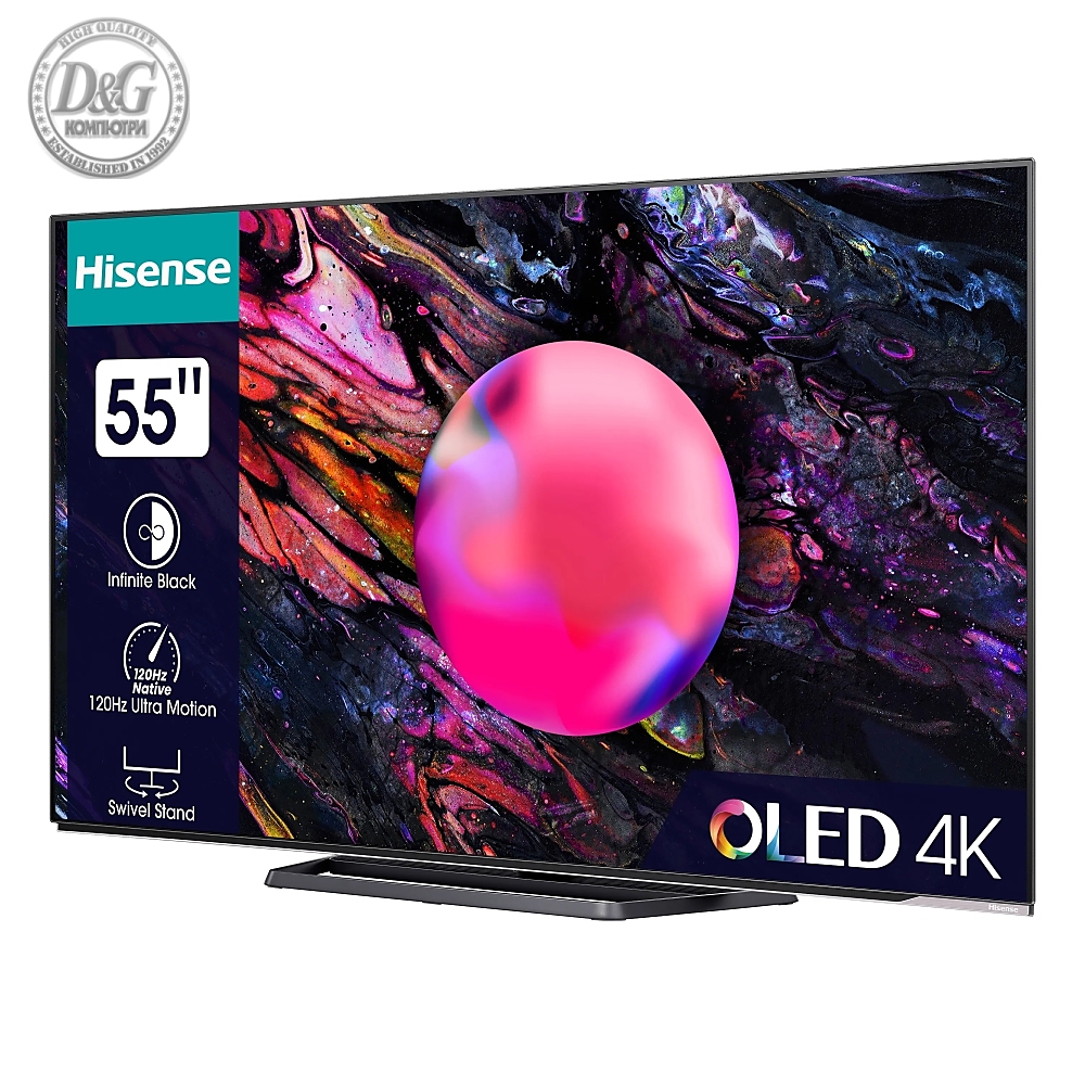 Hisense 55" A85K, 4K Ultra HD 3840x2160, OLED, 120Hz, IPS, HDR 10+, HLG, Dolby Vision IQ, Dolby Atmos, Smart TV, WiFi 6E, WiFi Direct, BT, Anyview Cast, 4xHDMI, 2xUSB, LAN, CI+, DVB-T2/C/S2, Black