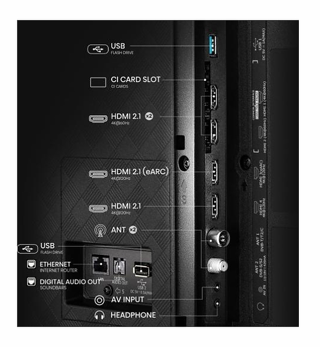 Изводи за свързване: 4 HDMI, 2 USB, S/PDIF out, CI+ Slot, Composite (AV) in, 2 RF In, Audio (L/R) in