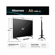 Hisense 75" A6Q, 4K Ultra HD 3840x2160, DLED, DFA, Precision Colour, HDR 10+, HLG, Dolby Vision,Light sensor, Smart TV, WiFi, BT, AnyView Cast, Gaming Mode, 1xHDMI2 eArc, 3xHDMI, 2xUSB, LAN, CI+, DVB-T2/C/S2, Black