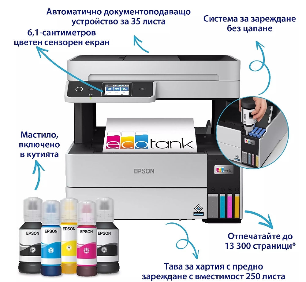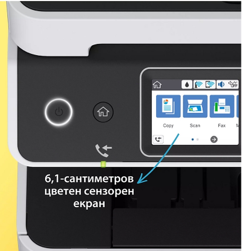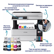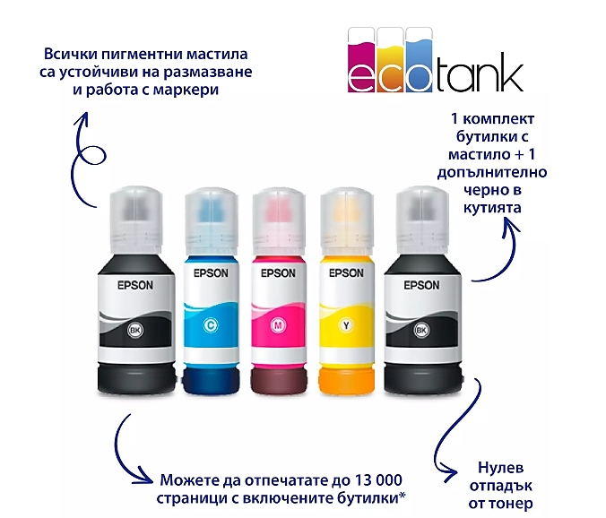 Консумативи: 112 EcoTank Pigment Black ink bottle (Up to 7500 pages); 112 EcoTank Pigment Cyan/Magenta/Yellow ink bottles (Up to 6000 pages each color)