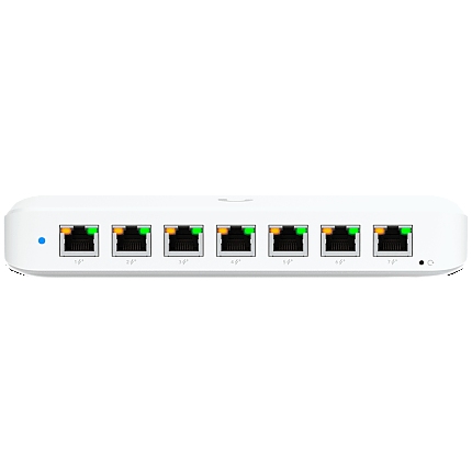 Ubiquiti USW-Ultra-210W-EU compact, Layer 2, 8-port GbE PoE switch with versatile mounting options, 7x GbE PoE+ output ports, GbE port with optional PoE++ input, 202W PoE availability with the included AC power adapter