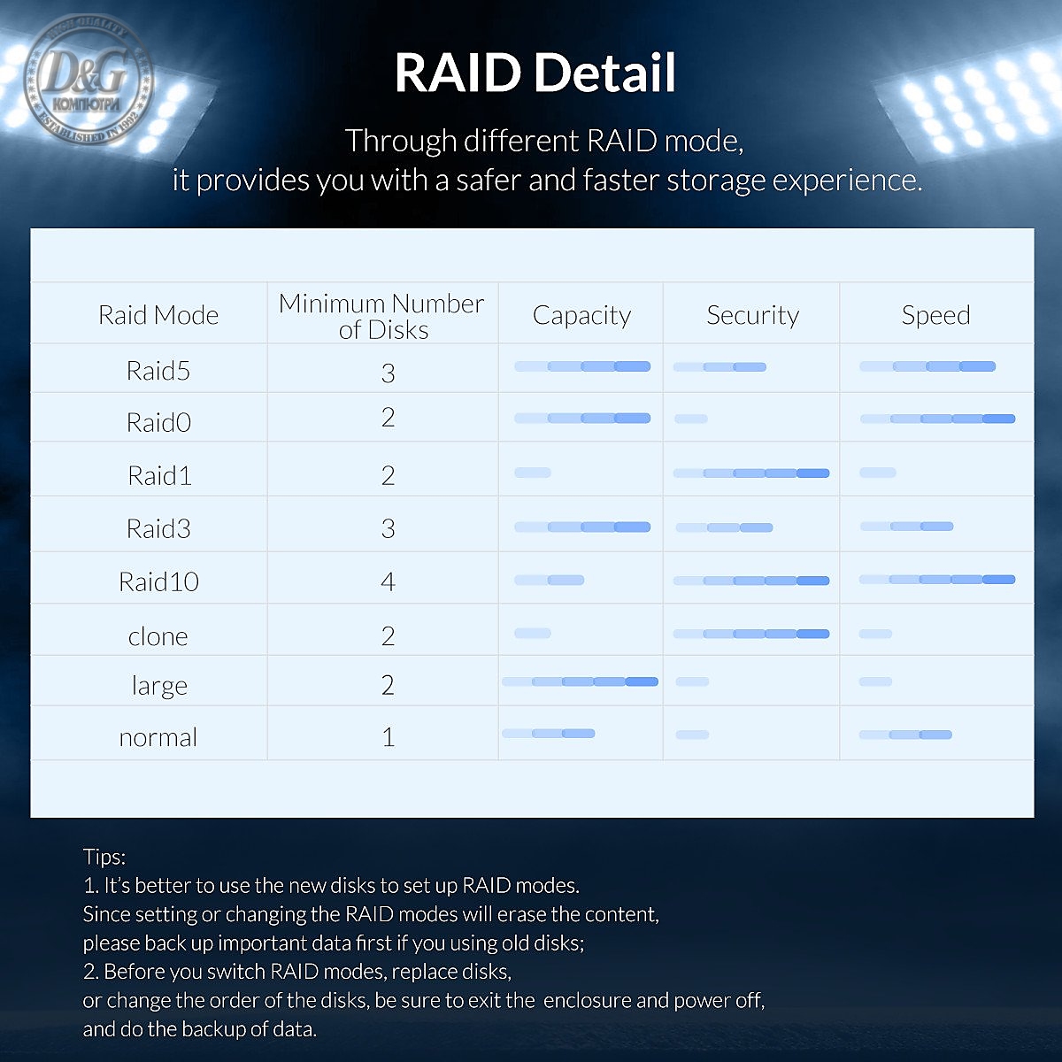 | Х-КА 5 | RAID modes suported : Raid 0, Raid 1, Raid 3, Raid 5, Raid 10, clone, large, normal |