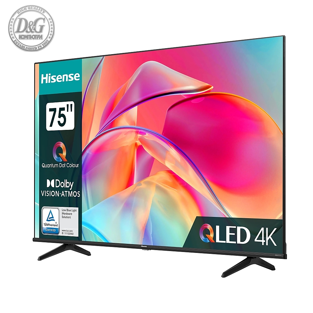 Hisense 75" E7Q, 4K Ultra HD 3840x2160, QLED, Quantum Dot, HDR 10+, HLG, Dolby Vision, DTS Virtual X, Smart TV, Light Sensor, WiFi Direct, BT, Anyview Cast, 3xHDMI, 2xUSB, LAN, CI+, DVB-T2/C/S2, Black