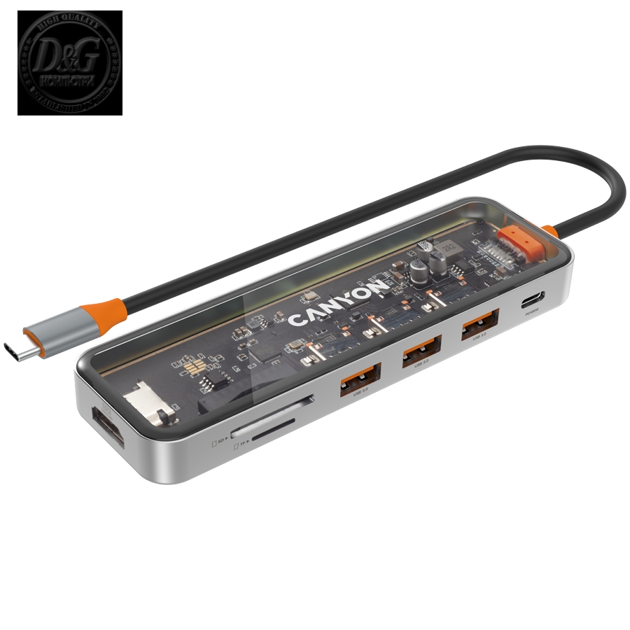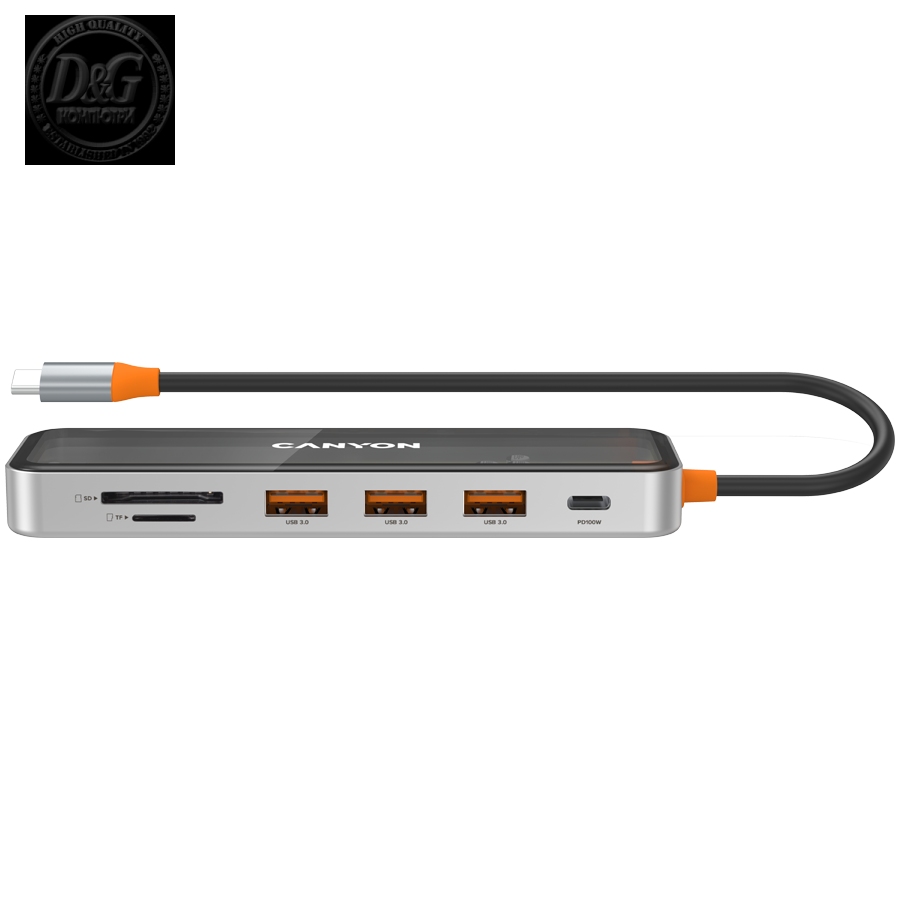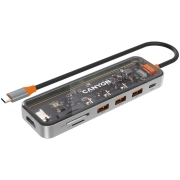 Canyon Laptop stands with hub, TYPE C F to HDMI2.0+2USB3.0+USBC3.0+RJ45+PD, TYEP C TO C cable 1m white with Emarker: HUSB332A, Material: Aluminum case+ABS+PS, Size: 245x240x27.2+/-0.3mm, Weight:1304g