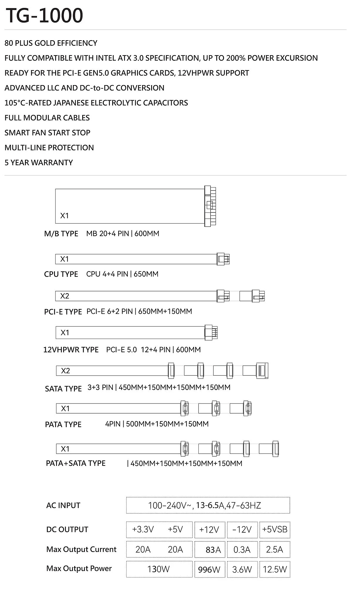 | ДРУГИ | Full Modular ATX 3.0 Specifications with 200% power excursion DC-DC LLC Half-Bridge Structure Durable 105 C Rated Quality Japanese Capacitors 100-240V Universal AC Volatage Support 120 mm Intelligent Start-Stop Fan |