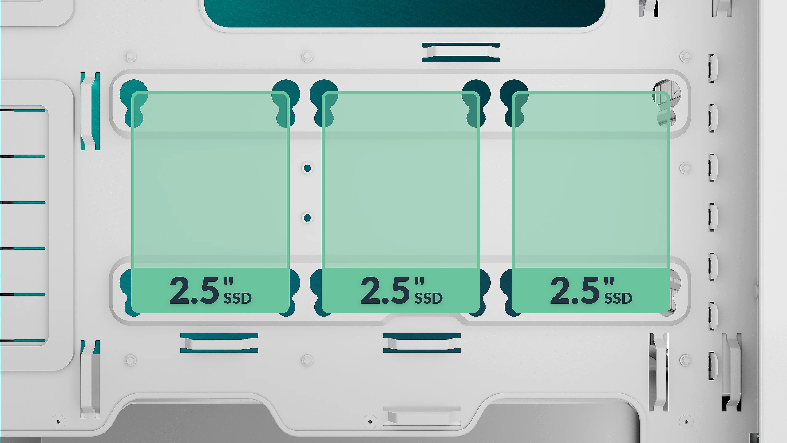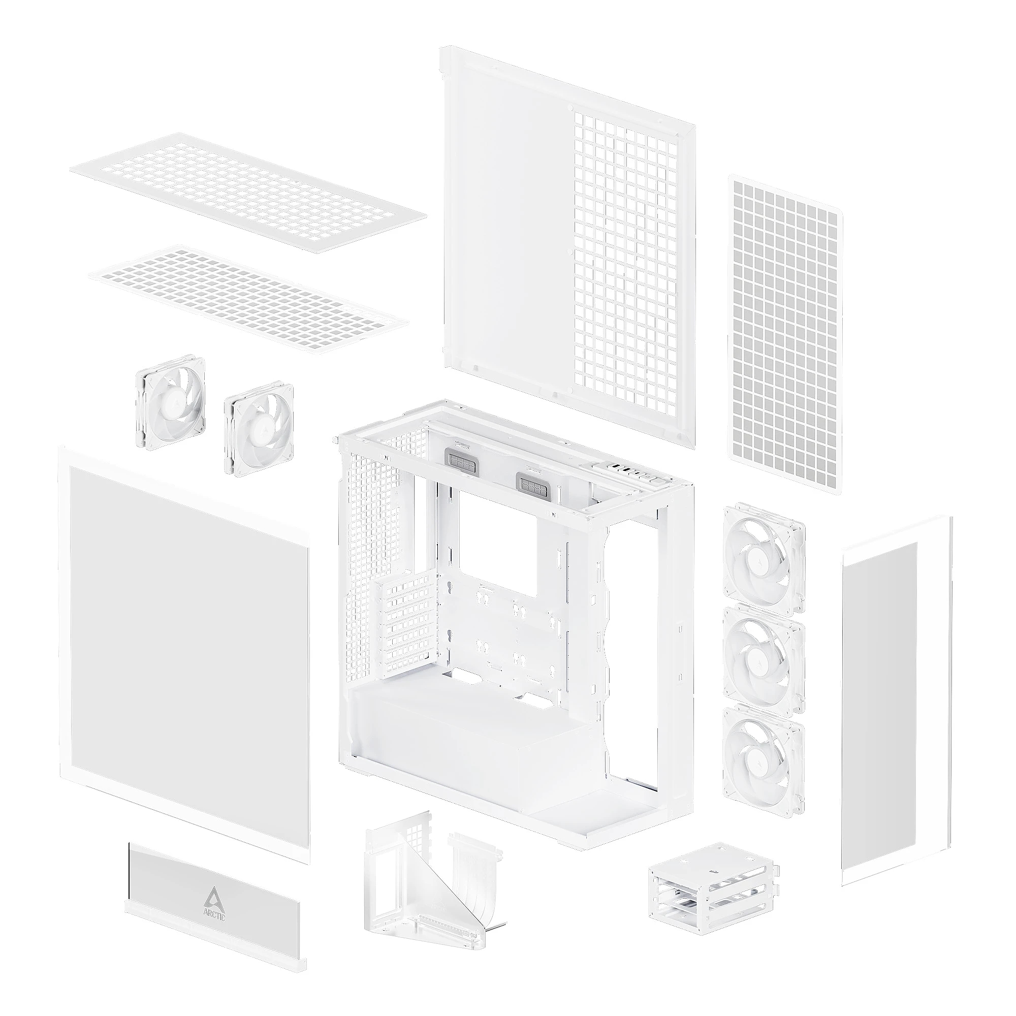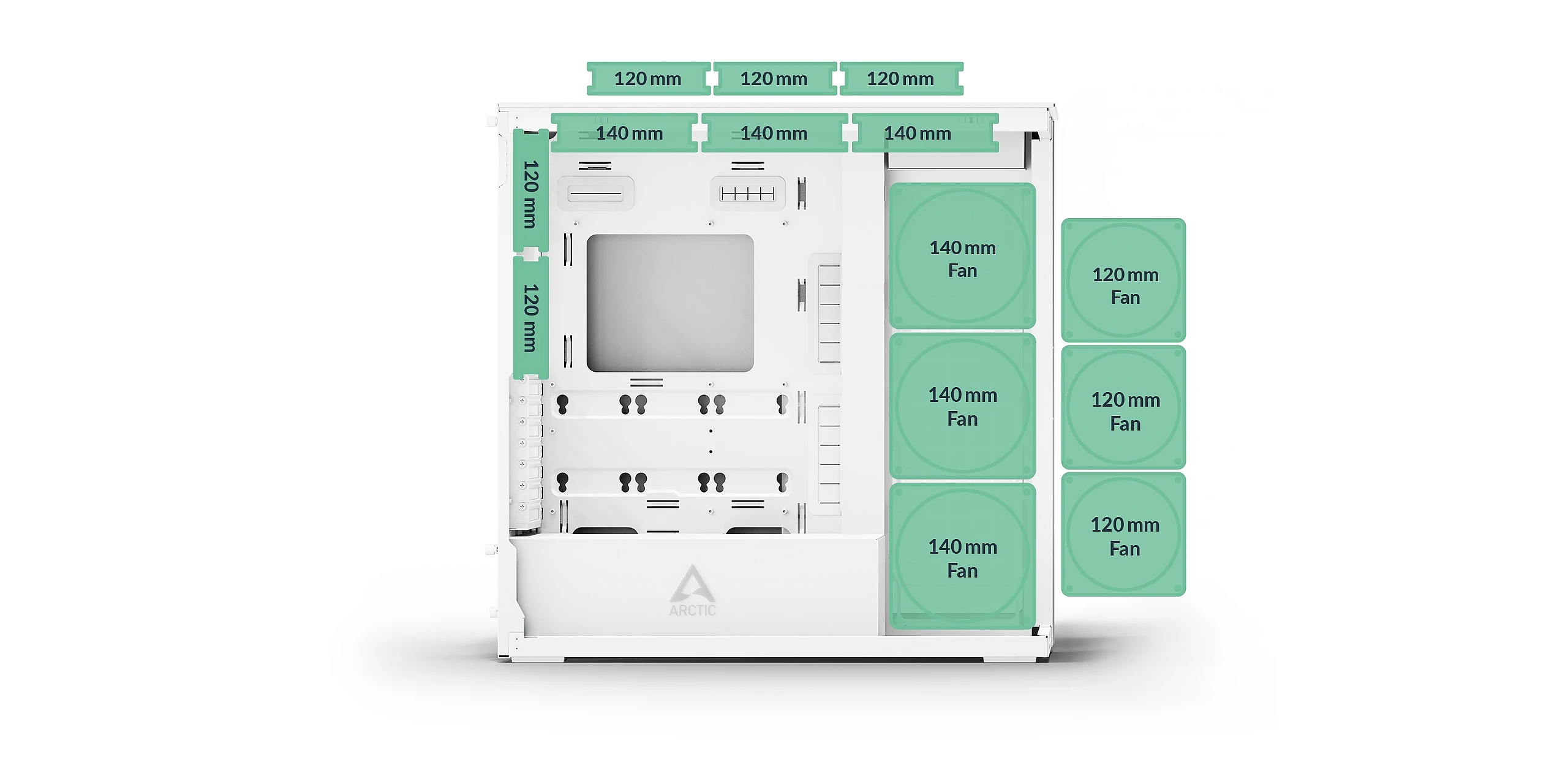 | ДОПЪЛНИТЕЛНИ | Enables vertical GPU installation with a 160 mm PCIe Gen 4 riser cable Five pre-installed fans Compatibility for 120 or 140 mm Fans Supports Two 420 mm Radiators Magnetic Mesh Filters Flexible Mounting for Up to Six Drives Includes Accessory Box 3D Cable Pass-Throughs for Improved Aesthetics Clean Cable Management |