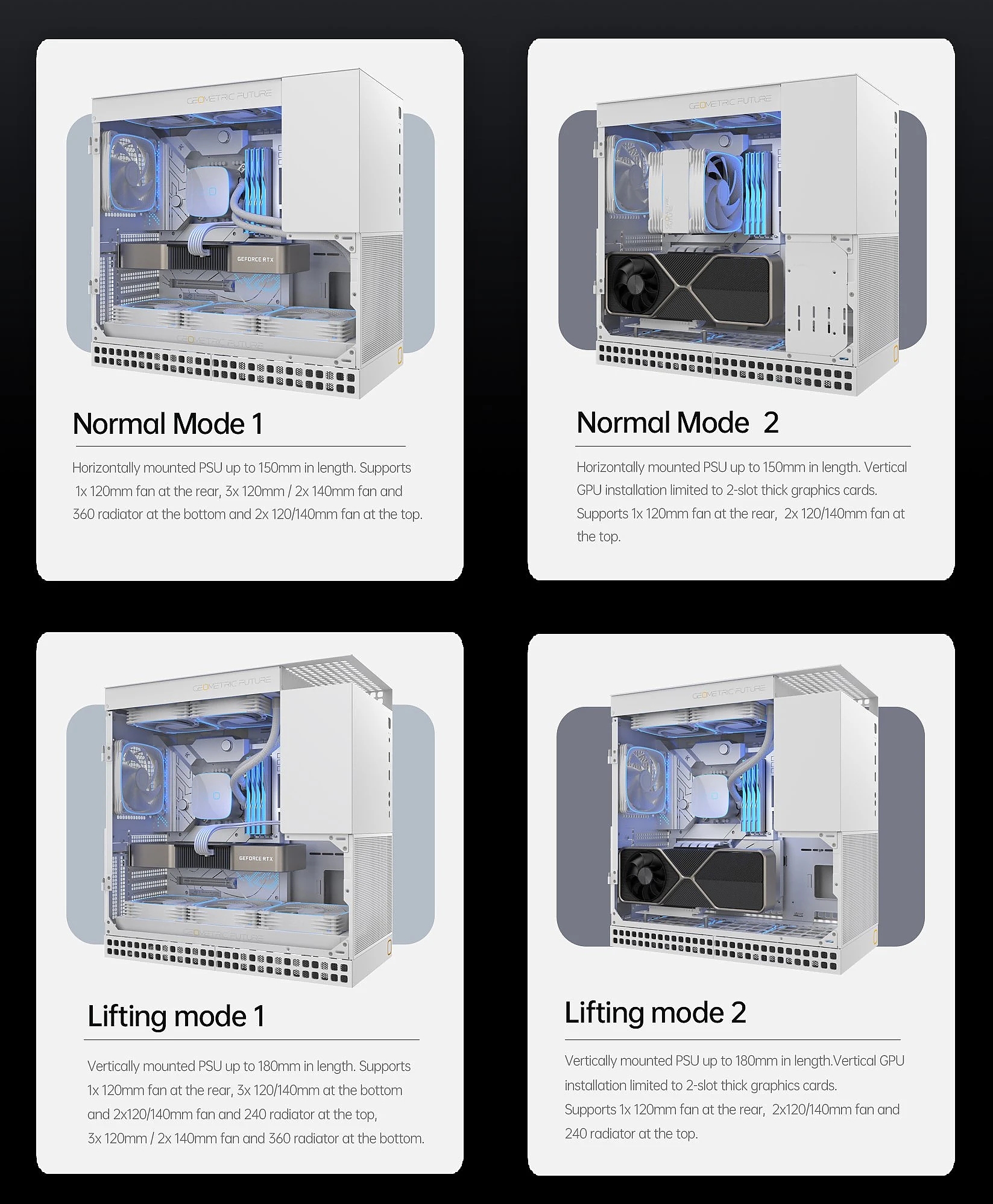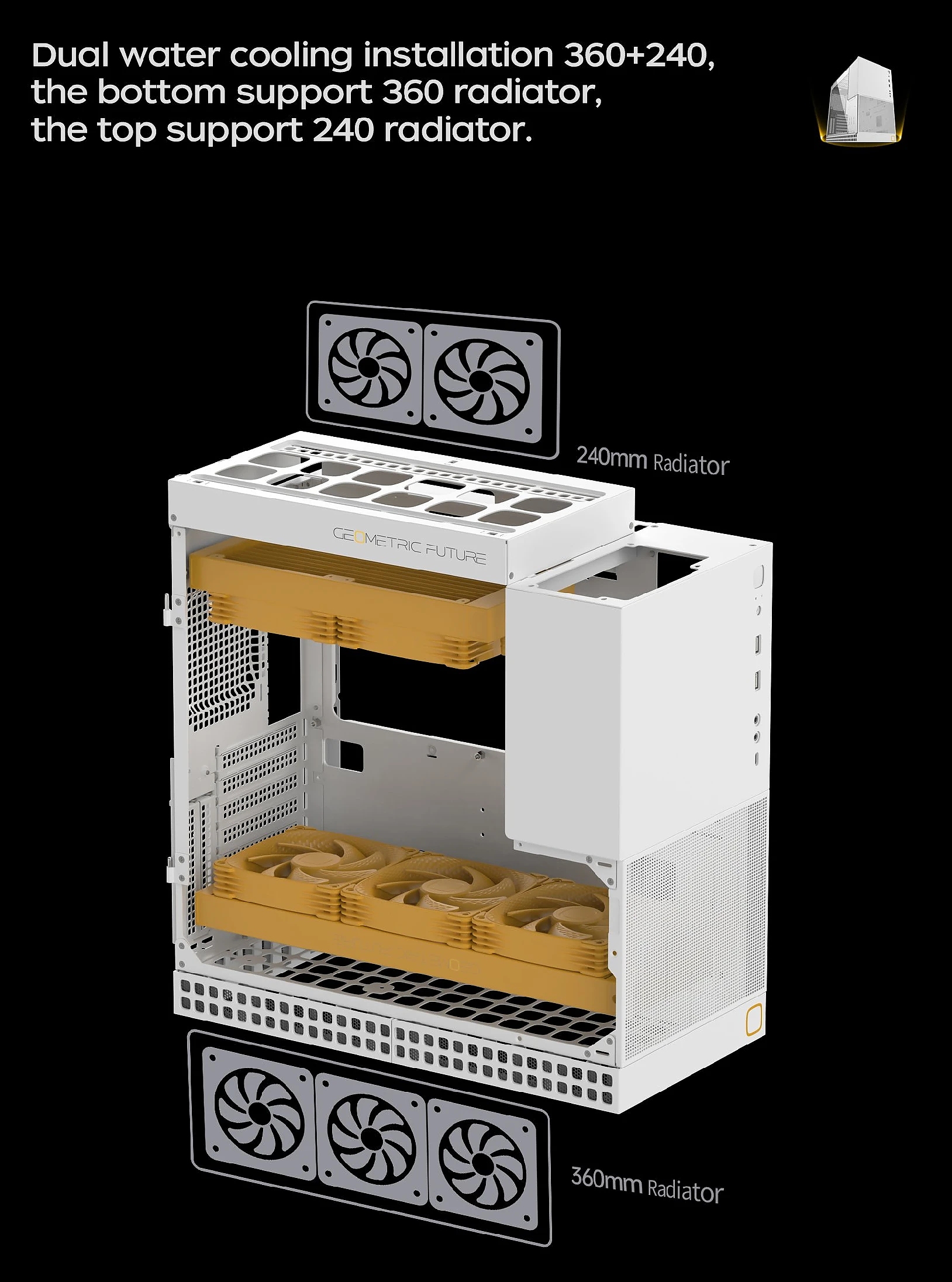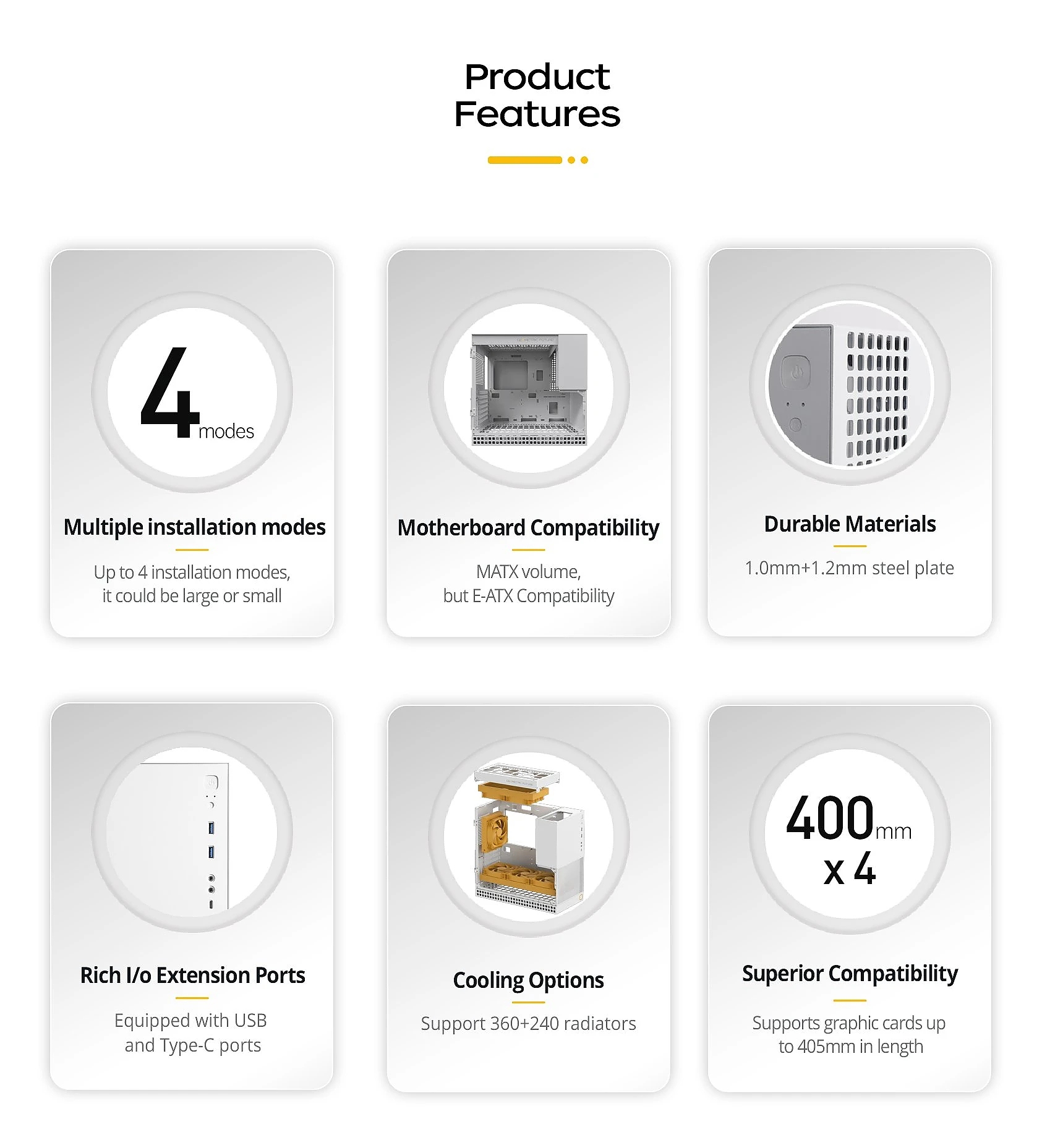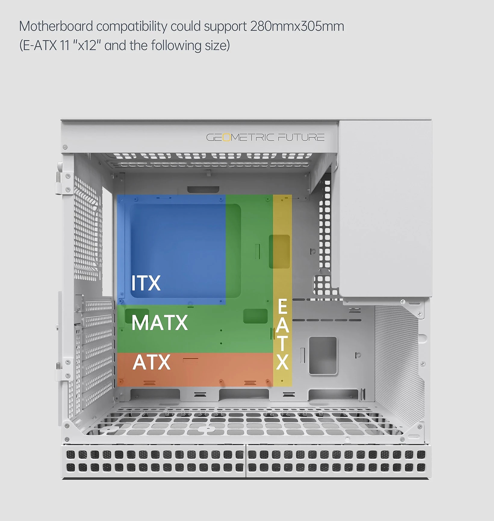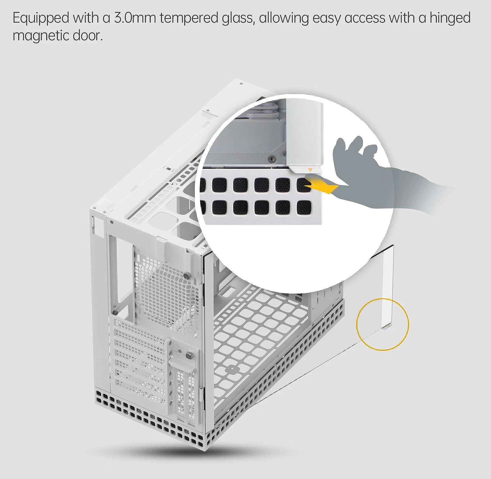 | ДОПЪЛНИТЕЛНИ | MATX volume, but E-ATX Compatibility 1.0 mm + 1.2 mm steel plate Supports graphic cards up to 405 mm in length Up to 4 installation modes, it could be large or small 3.0 mm Tempered Glass, hinged magnetic door Mesh footstand |