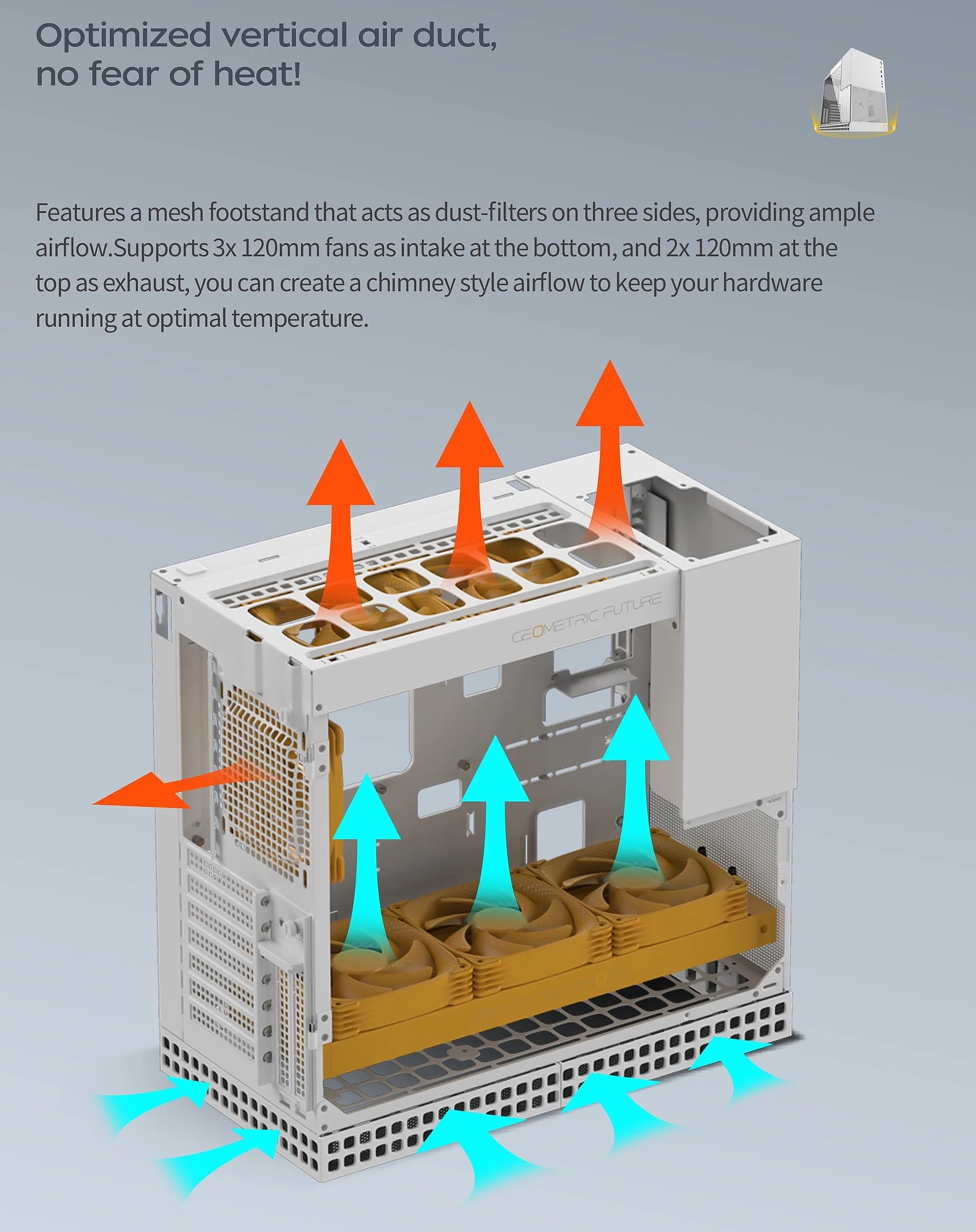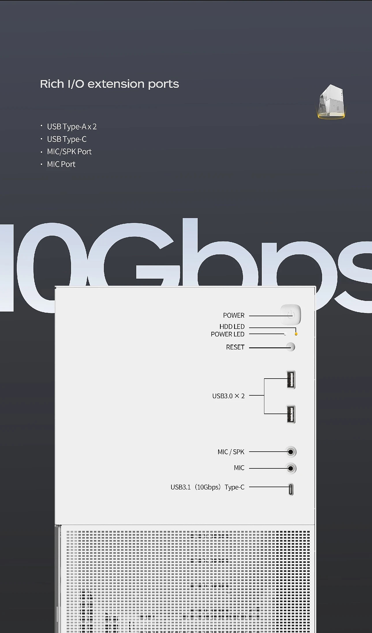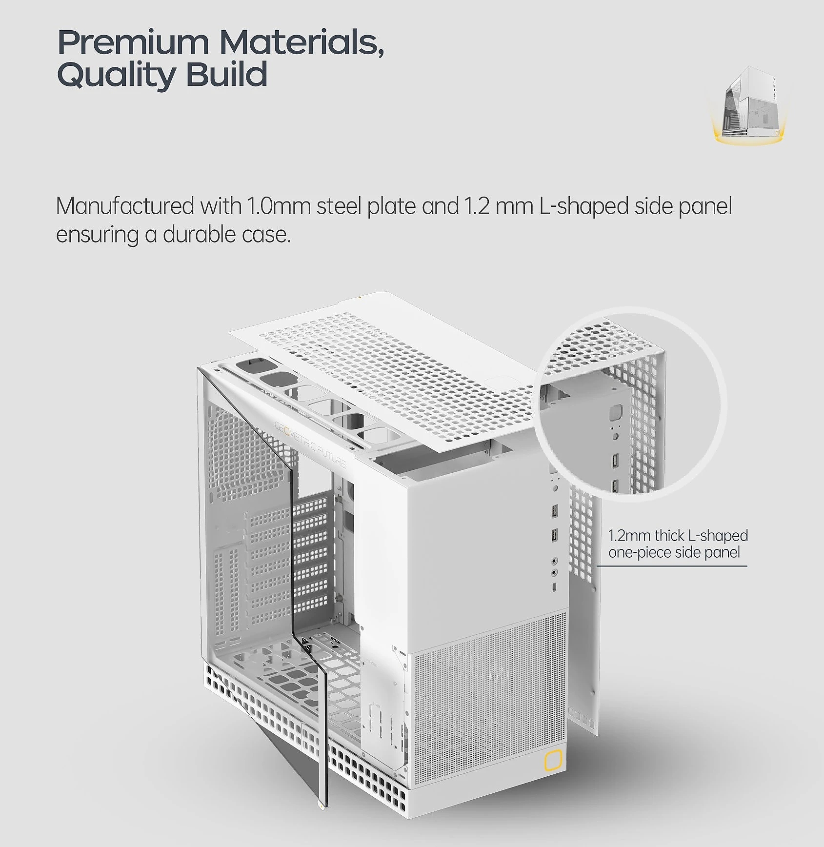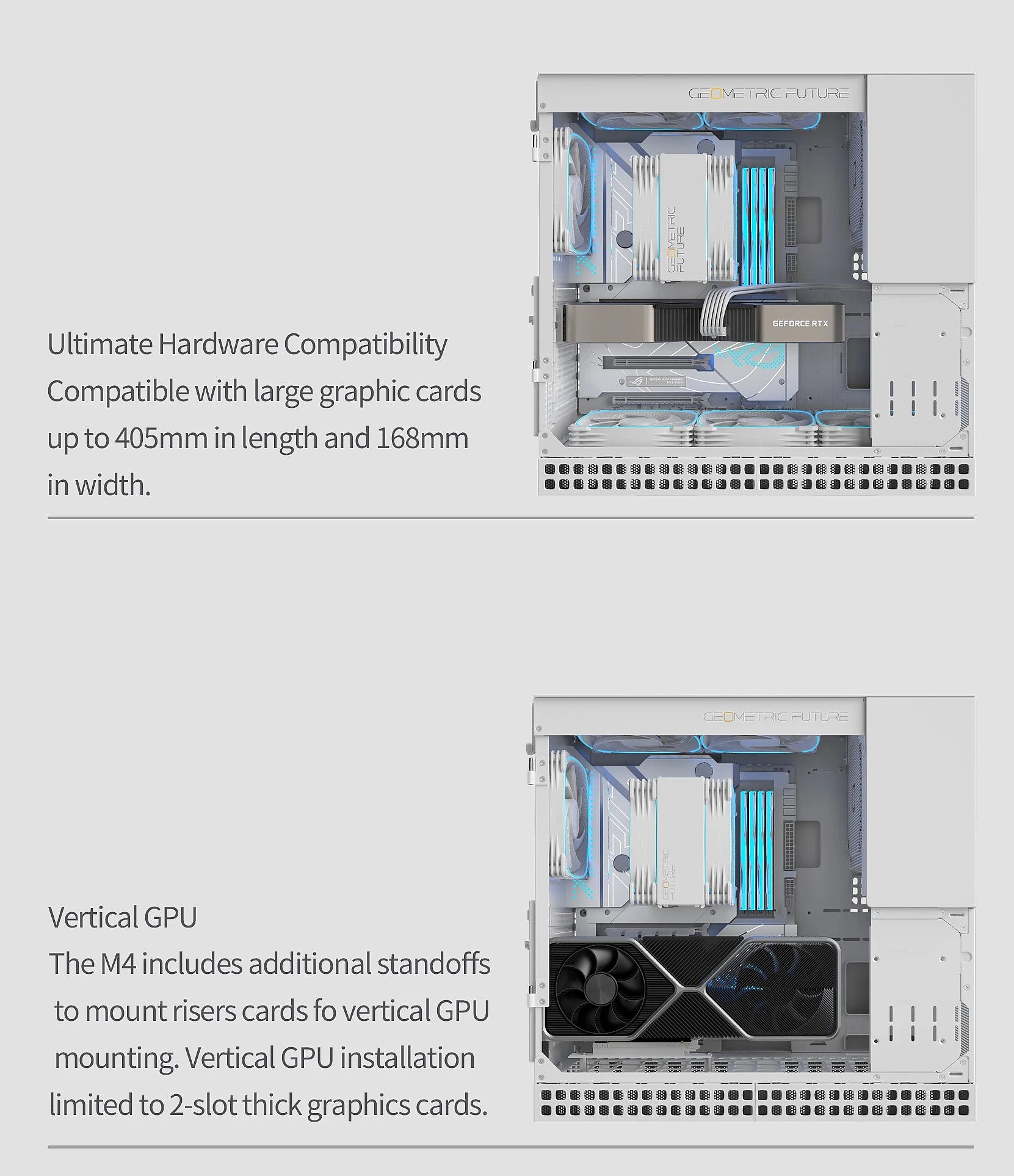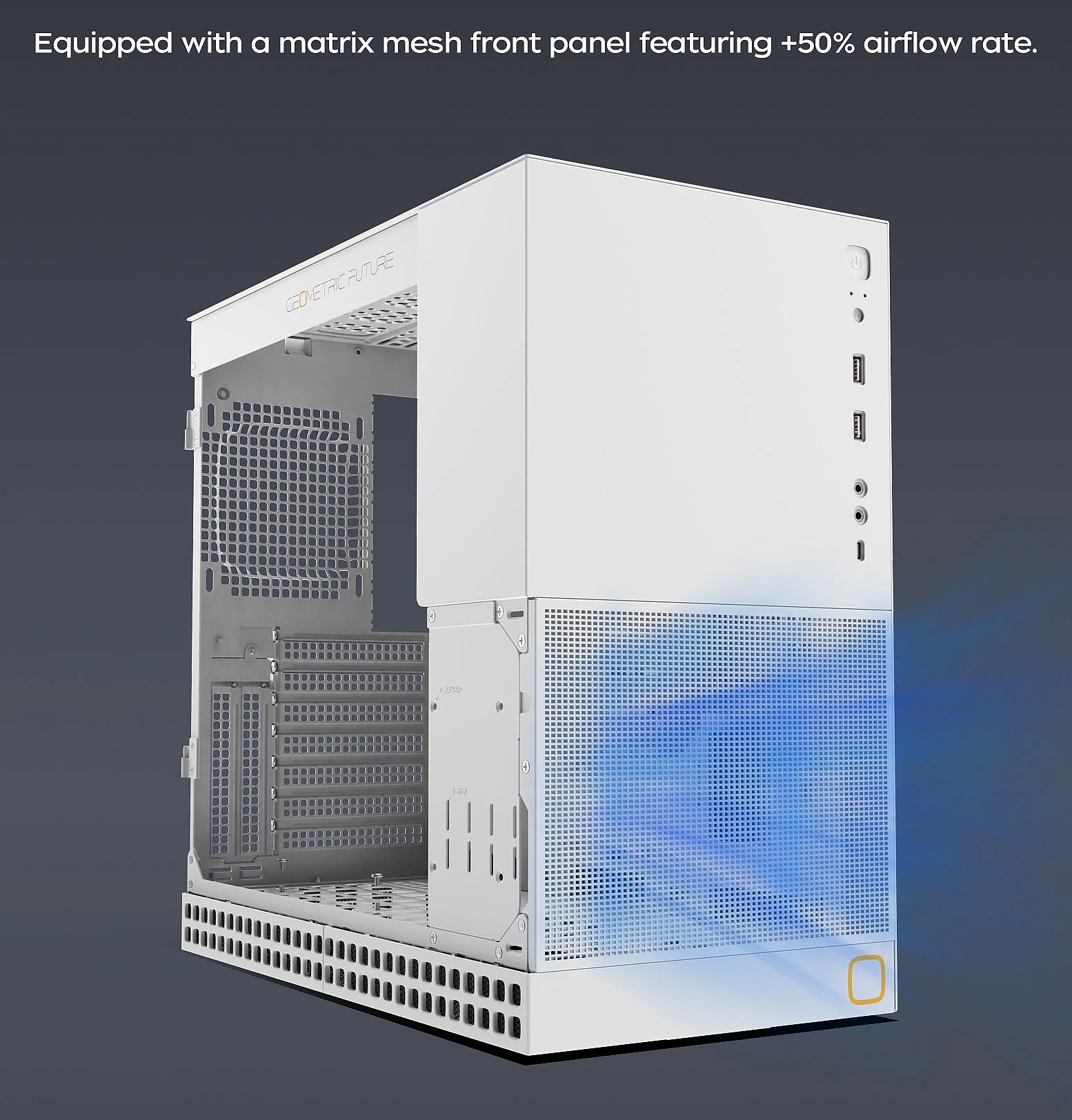 | ДОПЪЛНИТЕЛНИ | MATX volume, but E-ATX Compatibility 1.0 mm + 1.2 mm steel plate Supports graphic cards up to 405 mm in length Up to 4 installation modes, it could be large or small 3.0 mm Tempered Glass, hinged magnetic door Mesh footstand |