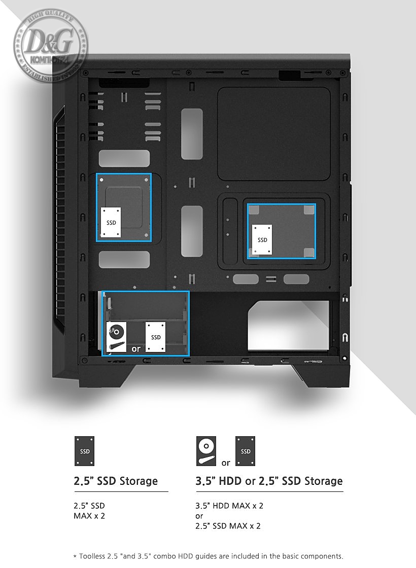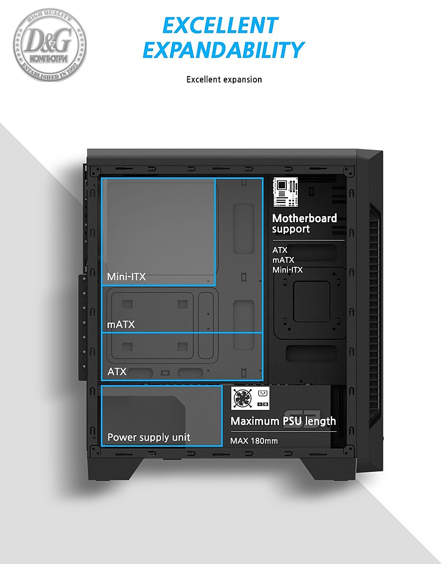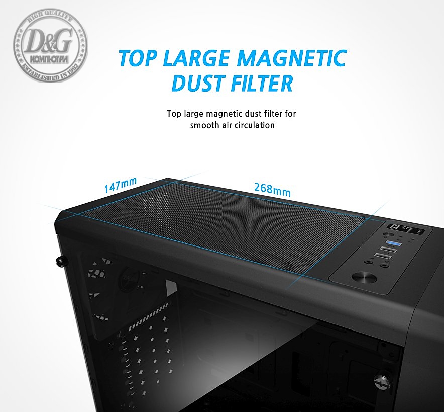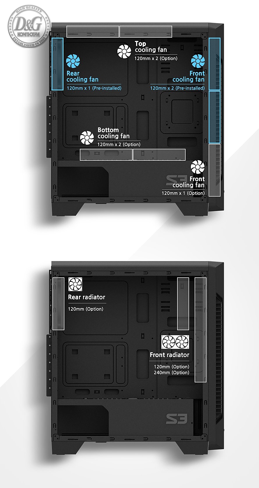 | ДОПЪЛНИТЕЛНИ | Full Acrylic side panel Възможност за монтаж на водно охлаждане до 240мм отпред Филтри за прах |