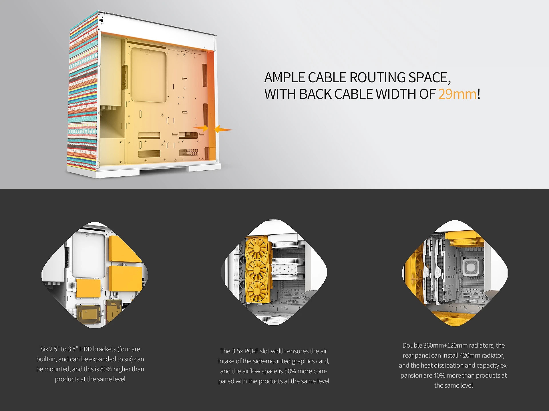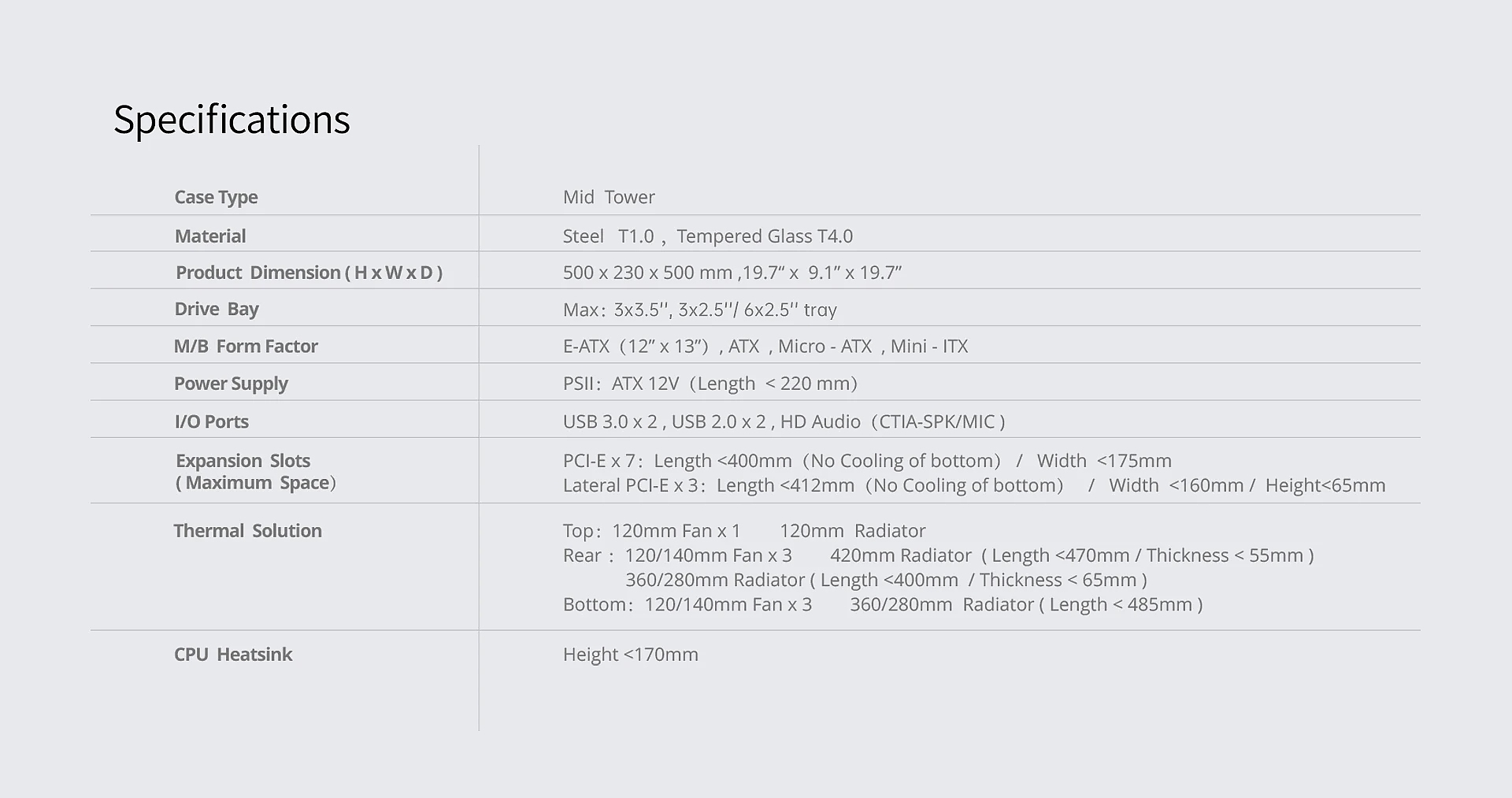 | ДОПЪЛНИТЕЛНИ | Ample cable routing space with back cable width of 29 mm Equipped with USB3.1 type-c port with transmission speed up to 10Gbps The 3.5x PCI-E slot width ensures the air intake of the side-mounted graphics card |
